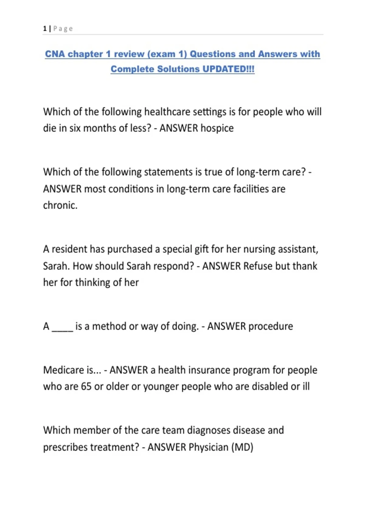 CNA chapter 1 review (exam 1) Questions and Answers with Complete Solutions UPDATED!!!.