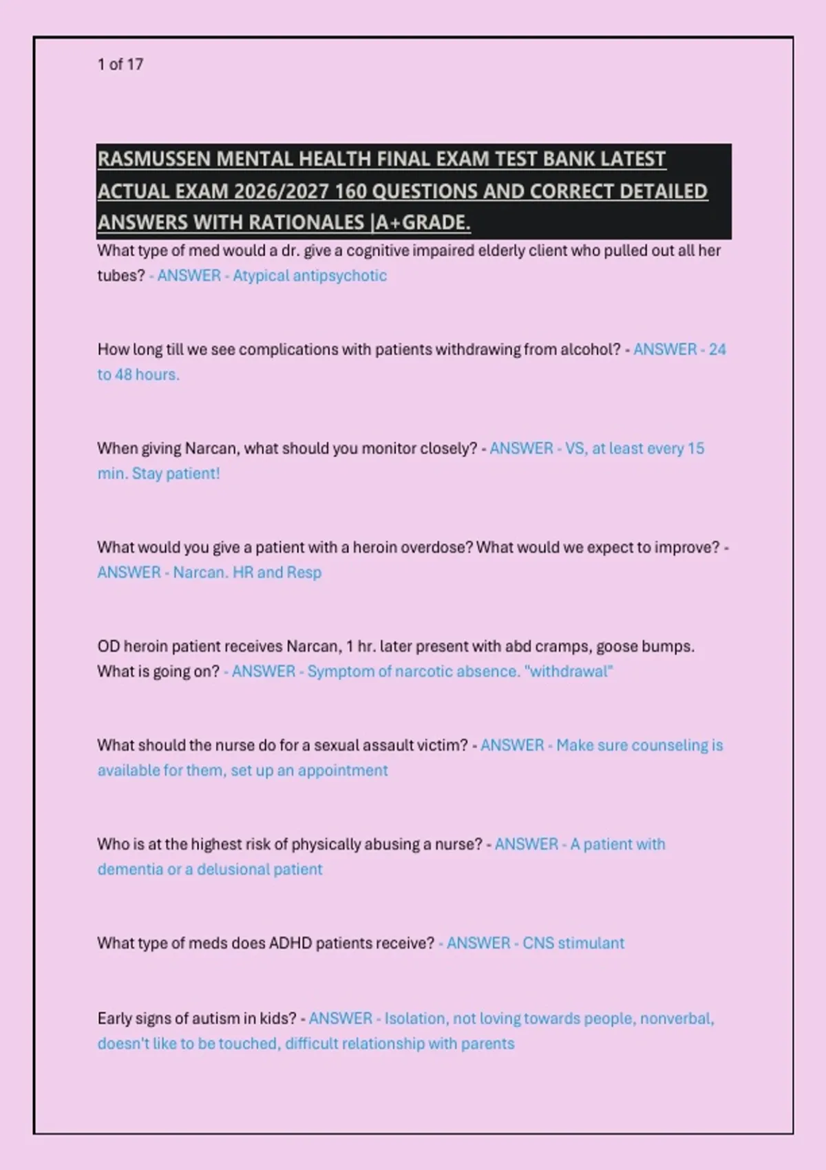 RASMUSSEN MENTAL HEALTH FINAL EXAM TEST BANK LATEST