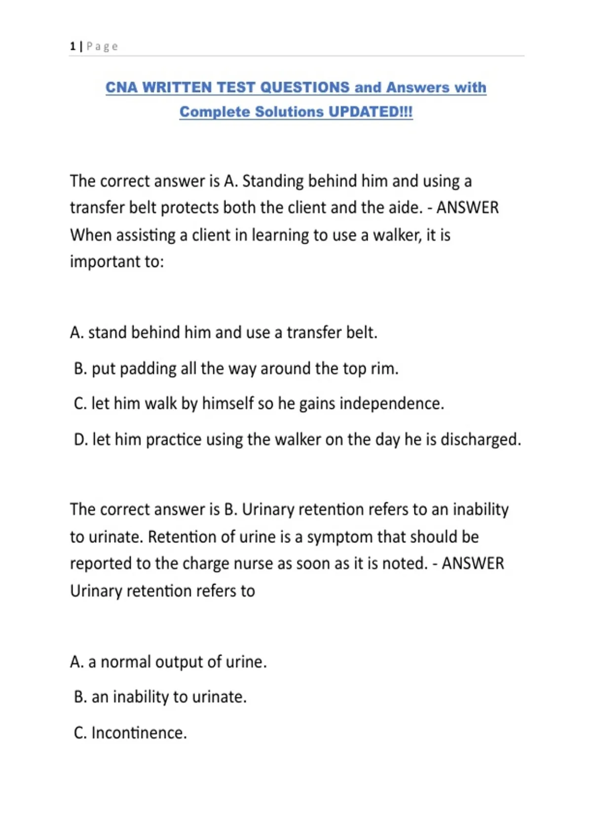 CNA WRITTEN TEST QUESTIONS and Answers with