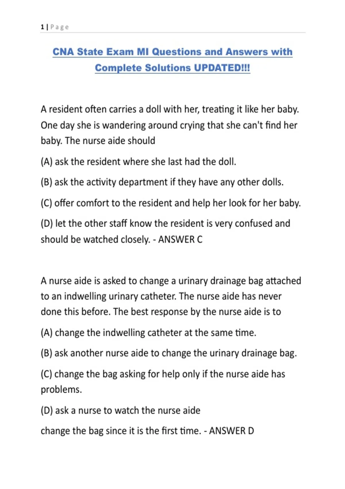 CNA State Exam MI Questions and Answers with Complete Solutions UPDATED!!!.