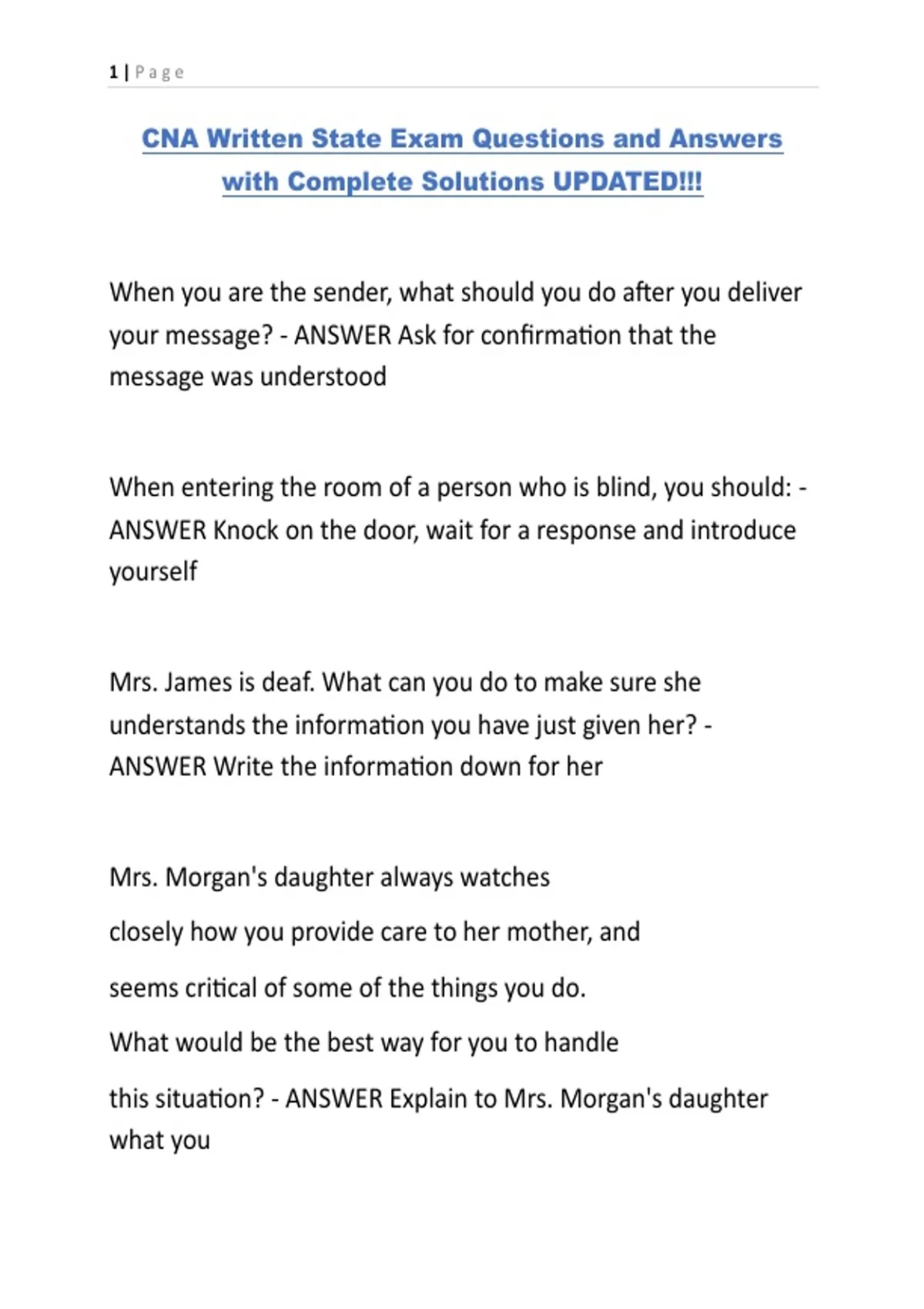 CNA Written State Exam Questions and Answers with Complete Solutions UPDATED!!!.