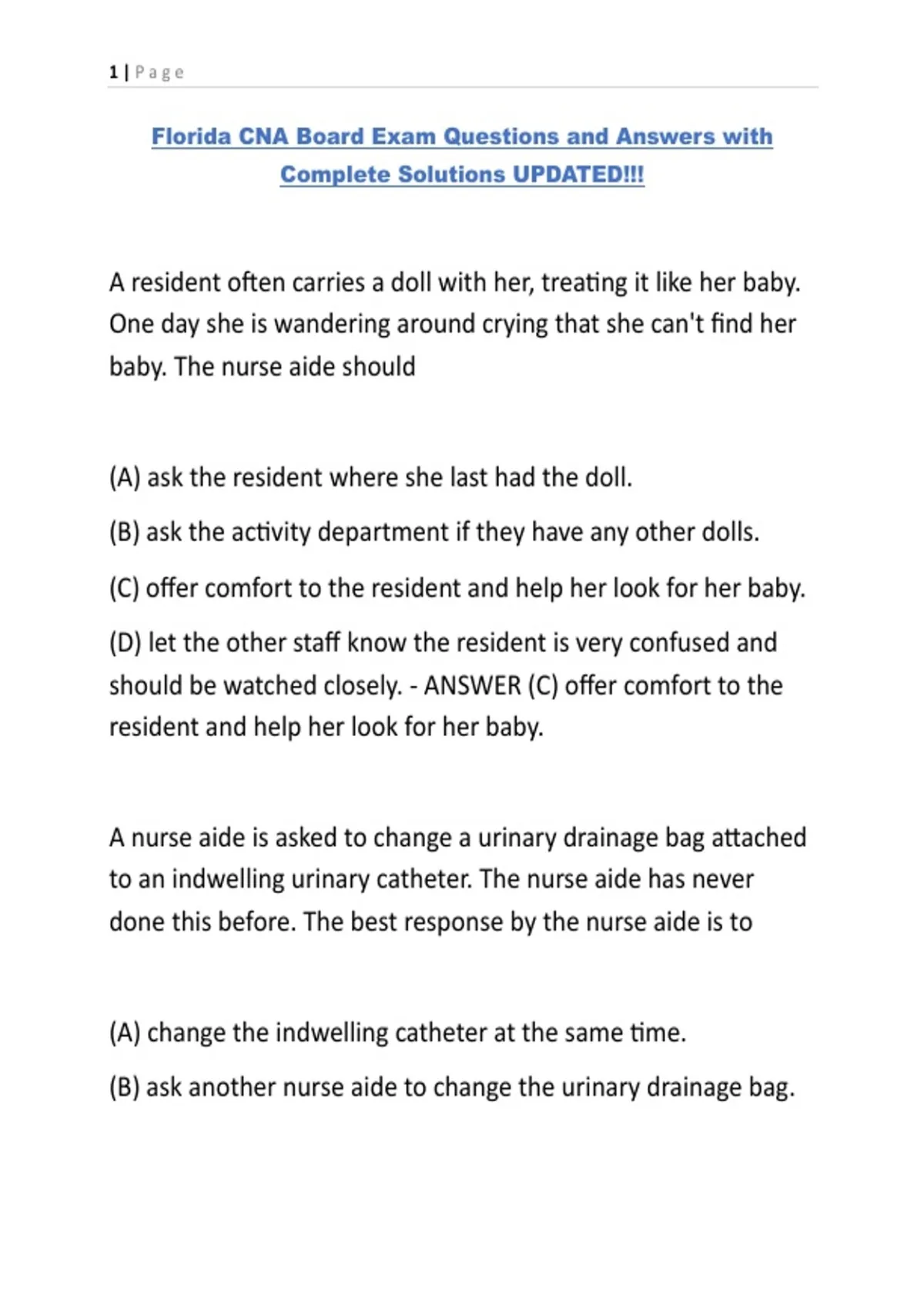 Florida CNA Board Exam Questions and Answers with