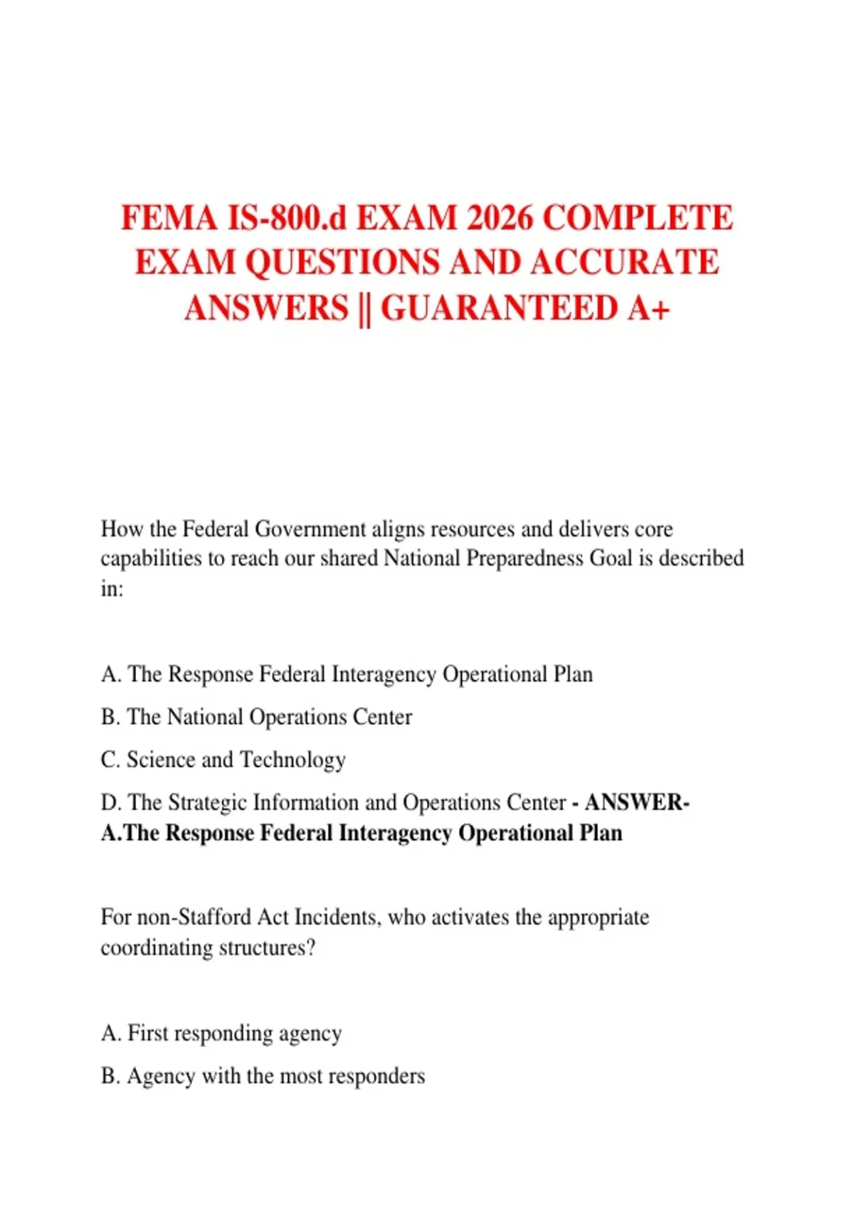 FEMA IS-800.d EXAM 2026 COMPLETE EXAM QUESTIONS AND ACCURATE ANSWERS || GUARANTEED A+