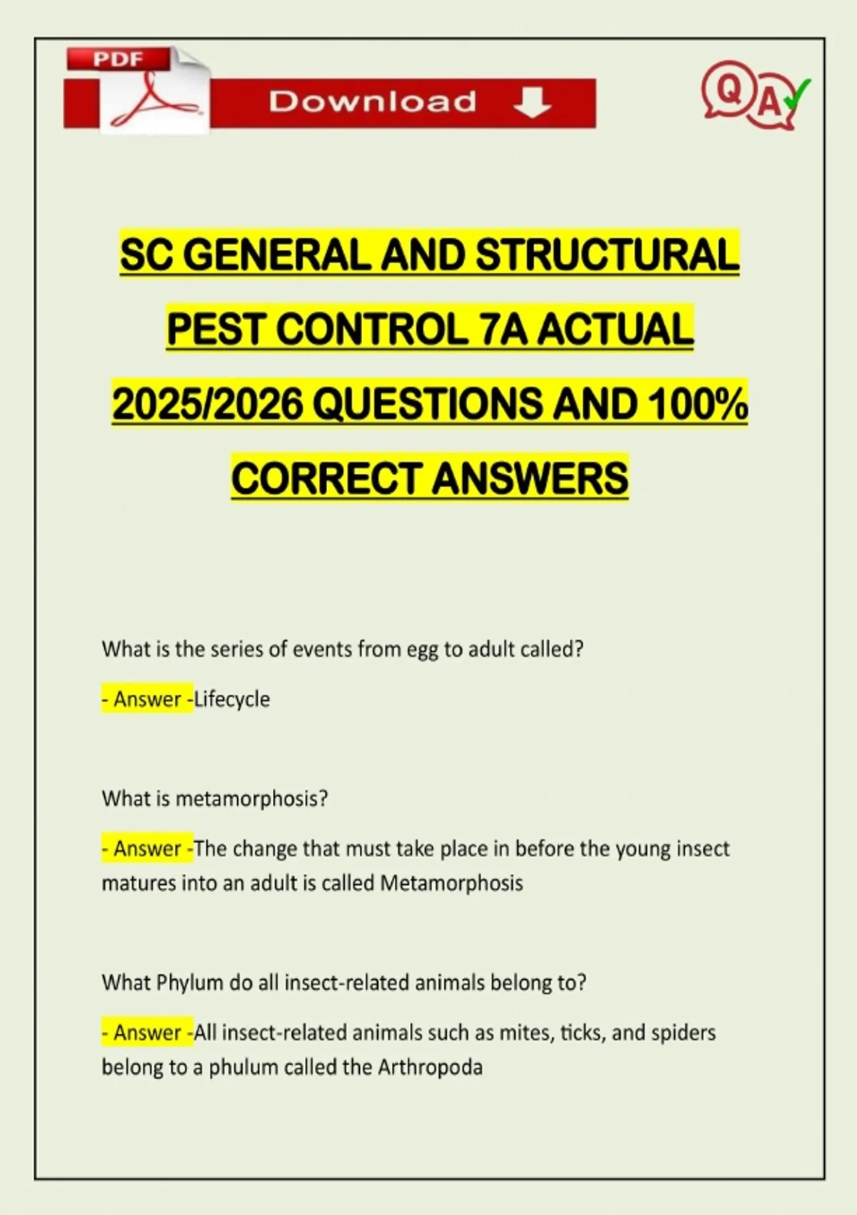 SC GENERAL AND STRUCTURAL PEST CONTROL 7A ACTUAL 2025/2026 QUESTIONS AND 100% CORRECT ANSWERS What is the series of events from egg to adult called? - Answer -Lifecycle What is metamorphosis? - Answer -The change that must take place in before the young insect matures into an adult is called Metamorphosis What Phylum do all insect-related animals belong to? - Answer -All insect-related animals such as mites, ticks, and spiders belong to a phulum called the ArthropodaNeed assistance on Online classes, Exams & Assignments? Reach out for instant help!! Full Course Assistance, Plagiarism-free Essay Writing, Research Paper, Dissertation, Discussion Posts, etc…. Confidential & Secure services. Tutors are available for all subjects! Email now at: What are Arachnids? - Answer -Spiders, Mites, scorpions, and ticks. Most arthropod pests are insects or arachnids. - four pairs of legs - two body segments (abdomen and cephalothorax) Name the four control strategies used to attempt the control o