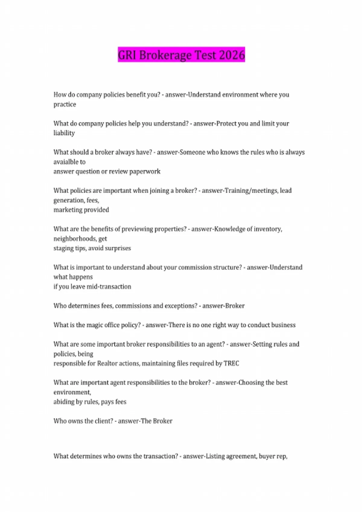 GRI Brokerage Test 2026 How do company policies benefit you? - answer-Understand environment where you practice What do company policies help you understand? - answer-Protect you and limit your liability What should a broker always have? - answer-Someone who knows the rules who is always avaialble to answer question or review paperwork What policies are important when joining a broker? - answer-Training/meetings, lead generation, fees, marketing provided What are the benefits of previewing properties? - answer-Knowledge of inventory, neighborhoods, get staging tips, avoid surprises What is important to understand about your commission structure? - answer-Understand what happens if you leave mid-transaction Who determines fees, commissions and exceptions? - answer-Broker What is the magic office policy? - answer-There is no one right way to conduct business What are some important broker responsibilities to an agent? - answer-Setting rules and policies, being responsible for Realtor actions, maintaining files required by TREC What are important agent responsibilities to the broker? - answer-Choosing the best environment, abiding by rules, pays fees Who owns the client? - answer-The Broker What determines who owns the transaction? - answer-Listing agreement, buyer rep, independent contractor agreement Who is responsible for all advertising? - answer-The Broker