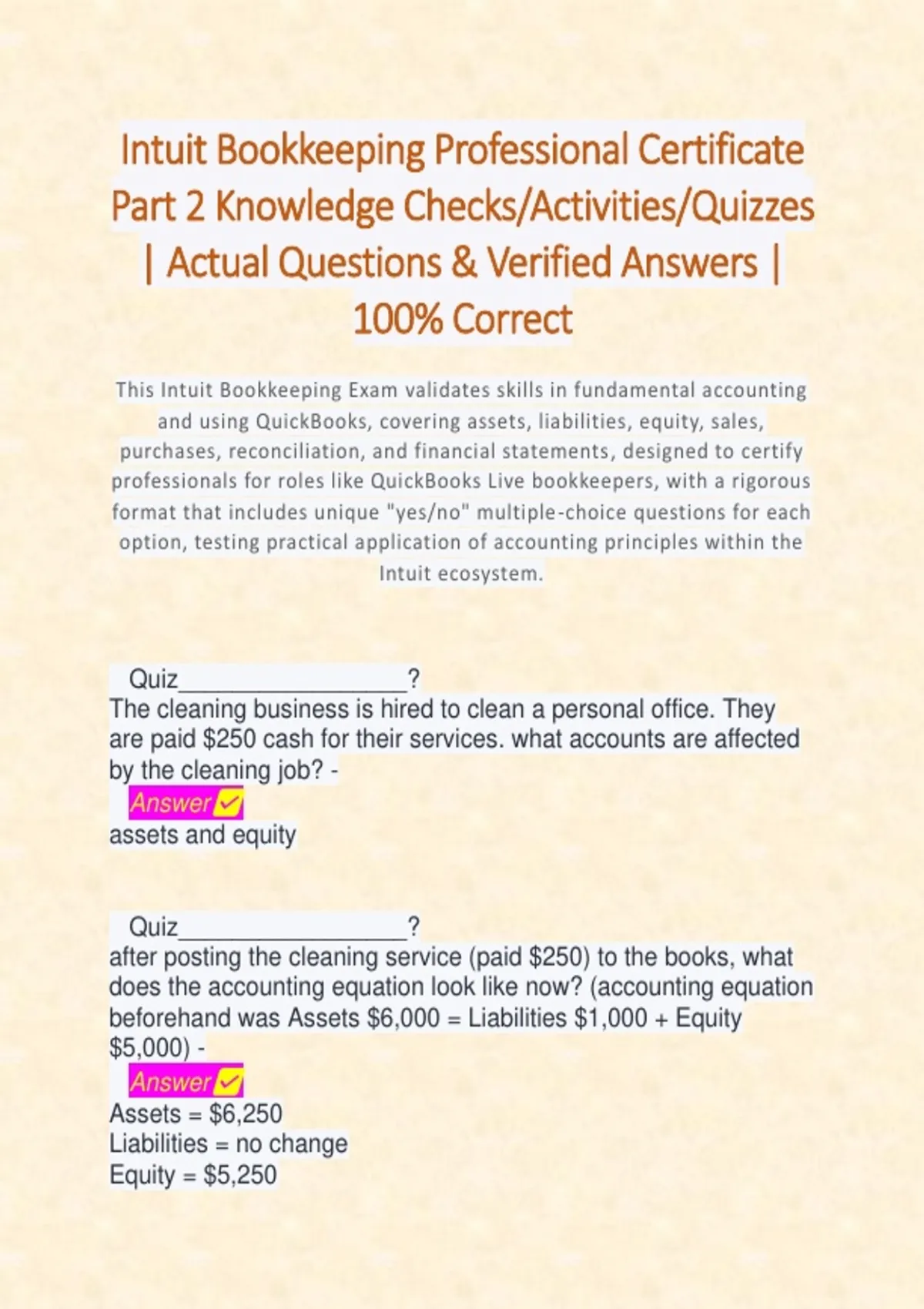 Intuit Bookkeeping Professional Certificate Part 2 Knowledge Checks/Activities/Quizzes | Actual Questions & Verified Answers | 100% Correct This Intuit Bookkeeping Exam validates skills in fundamental accounting and using QuickBooks, covering assets, liabilities, equity, sales, purchases, reconciliation, and financial statements, designed to certify professionals for roles like QuickBooks Live bookkeepers, with a rigorous format that includes unique "yes/no" multiple-choice questions for each option, testing practical application of accounting principles within the Intuit ecosystem.