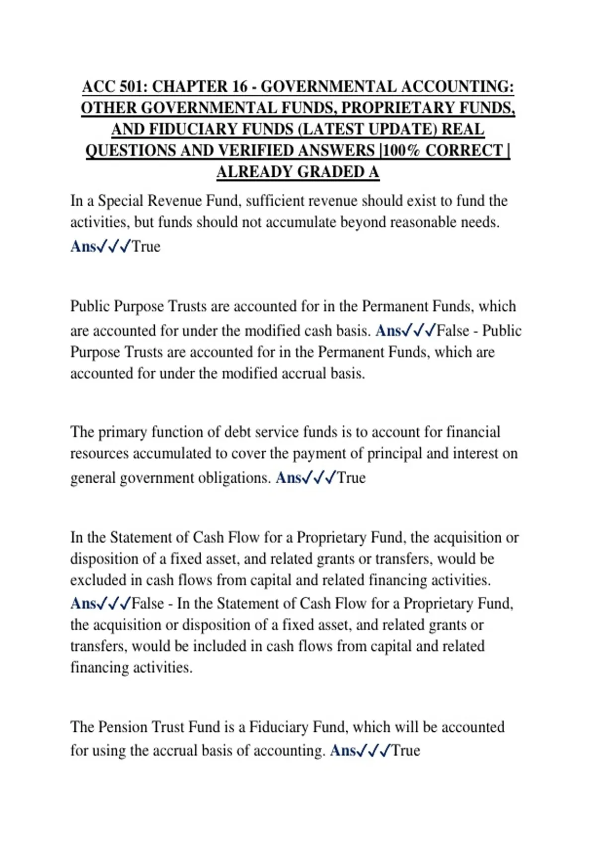 ACC 501: CHAPTER 16 - GOVERNMENTAL ACCOUNTING: OTHER GOVERNMENTAL FUNDS, PROPRIETARY FUNDS, AND FIDUCIARY FUNDS (LATEST UPDATE) REAL QUESTIONS AND VERIFIED ANSWERS |100% CORRECT | ALREADY GRADED A