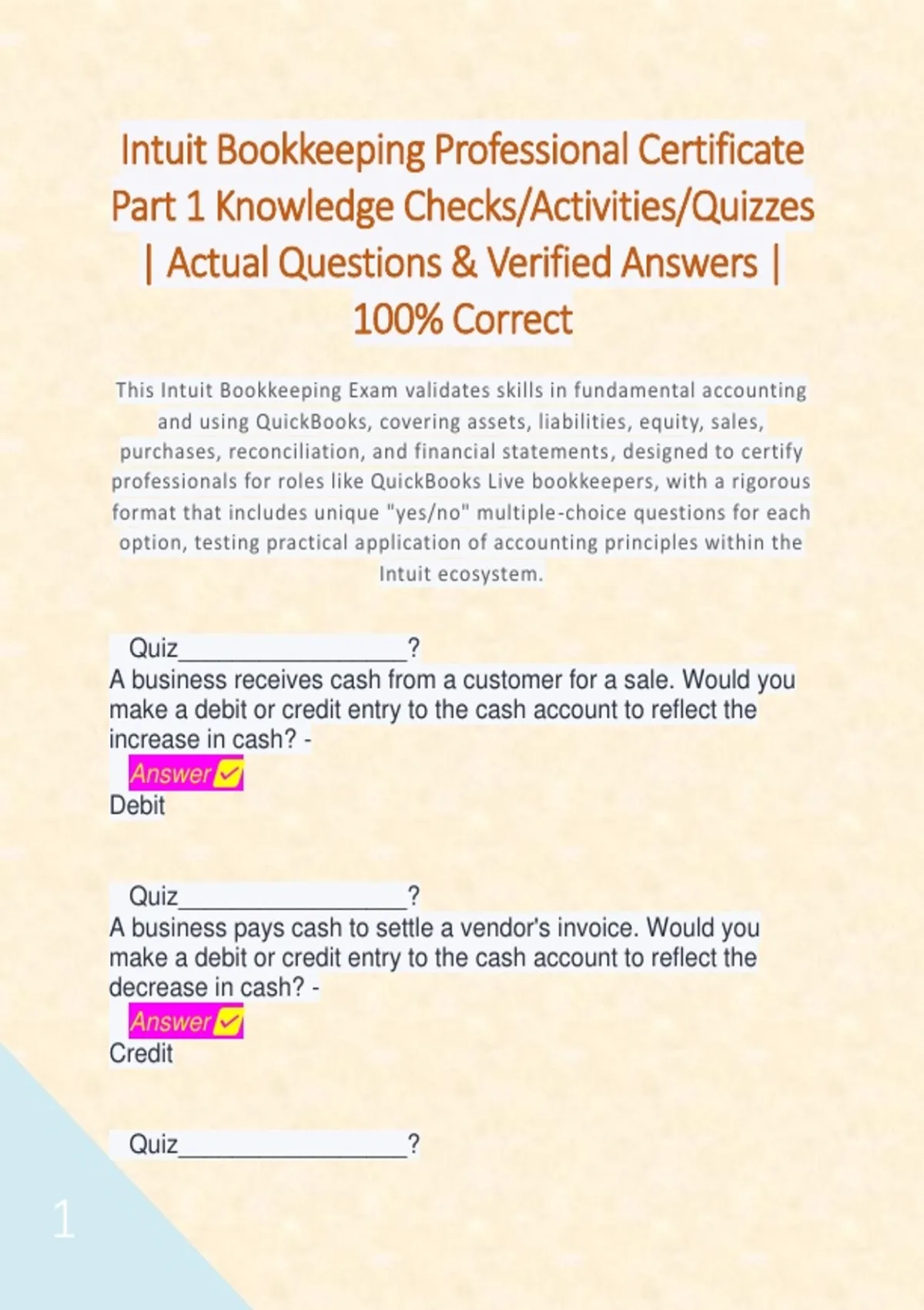 Intuit Bookkeeping Professional Certificate Part 1 Knowledge Checks/Activities/Quizzes | Actual Questions & Verified Answers | 100% Correct This Intuit Bookkeeping Exam validates skills in fundamental accounting and using QuickBooks, covering assets, liabilities, equity, sales, purchases, reconciliation, and financial statements, designed to certify professionals for roles like QuickBooks Live bookkeepers, with a rigorous format that includes unique "yes/no" multiple-choice questions for each option, testing practical application of accounting principles within the Intuit ecosystem.