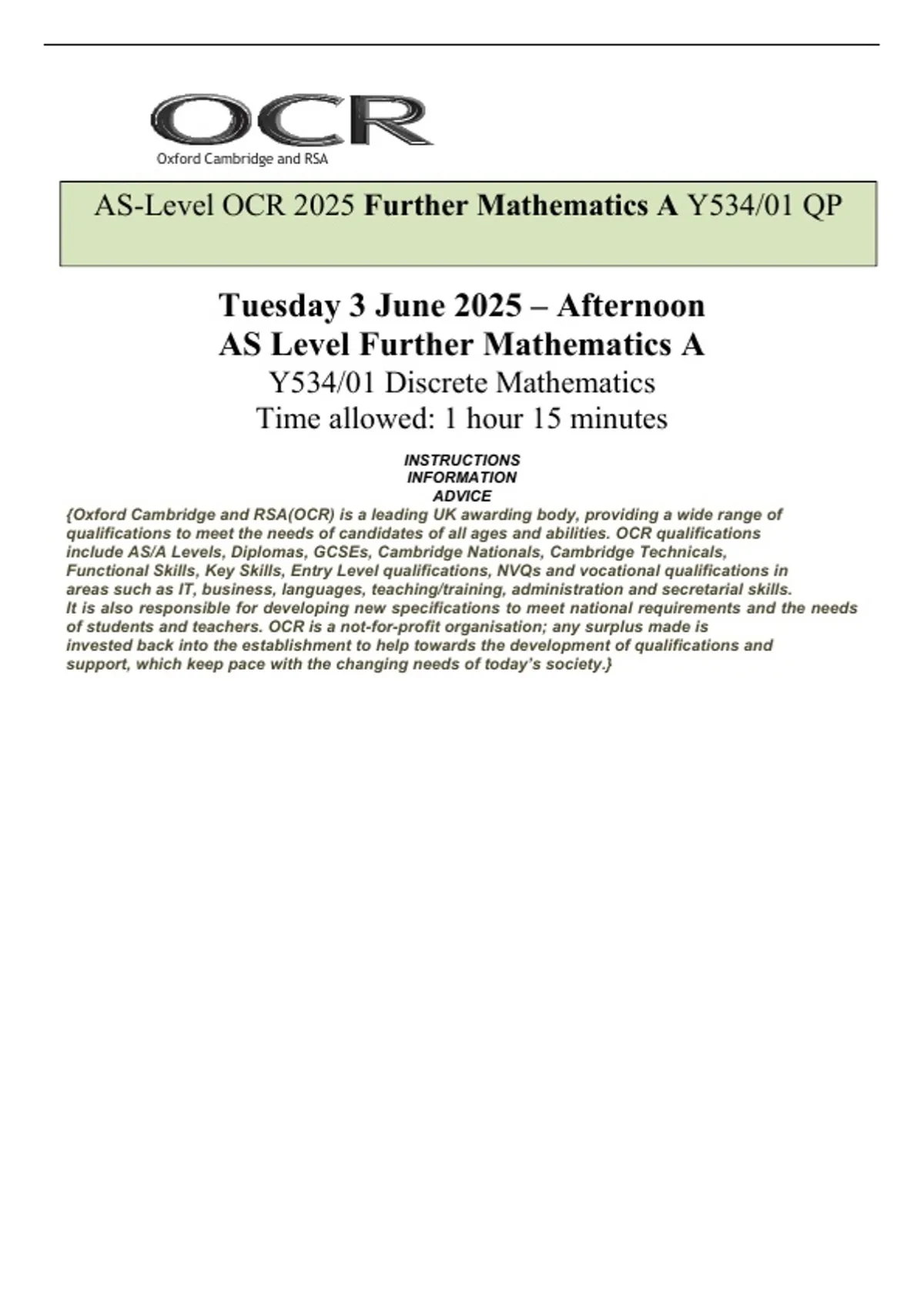 AS-Level OCR 2025 Further Mathematics A Y534/01 QP
