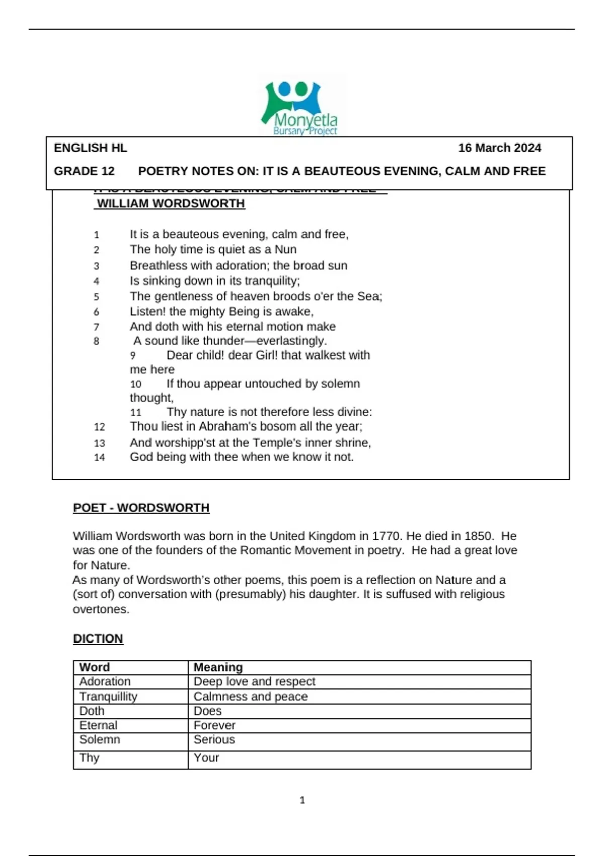 GRADE 12 POETRY NOTES ON: IT IS A BEAUTEOUS EVENING, CALM AND FREE
