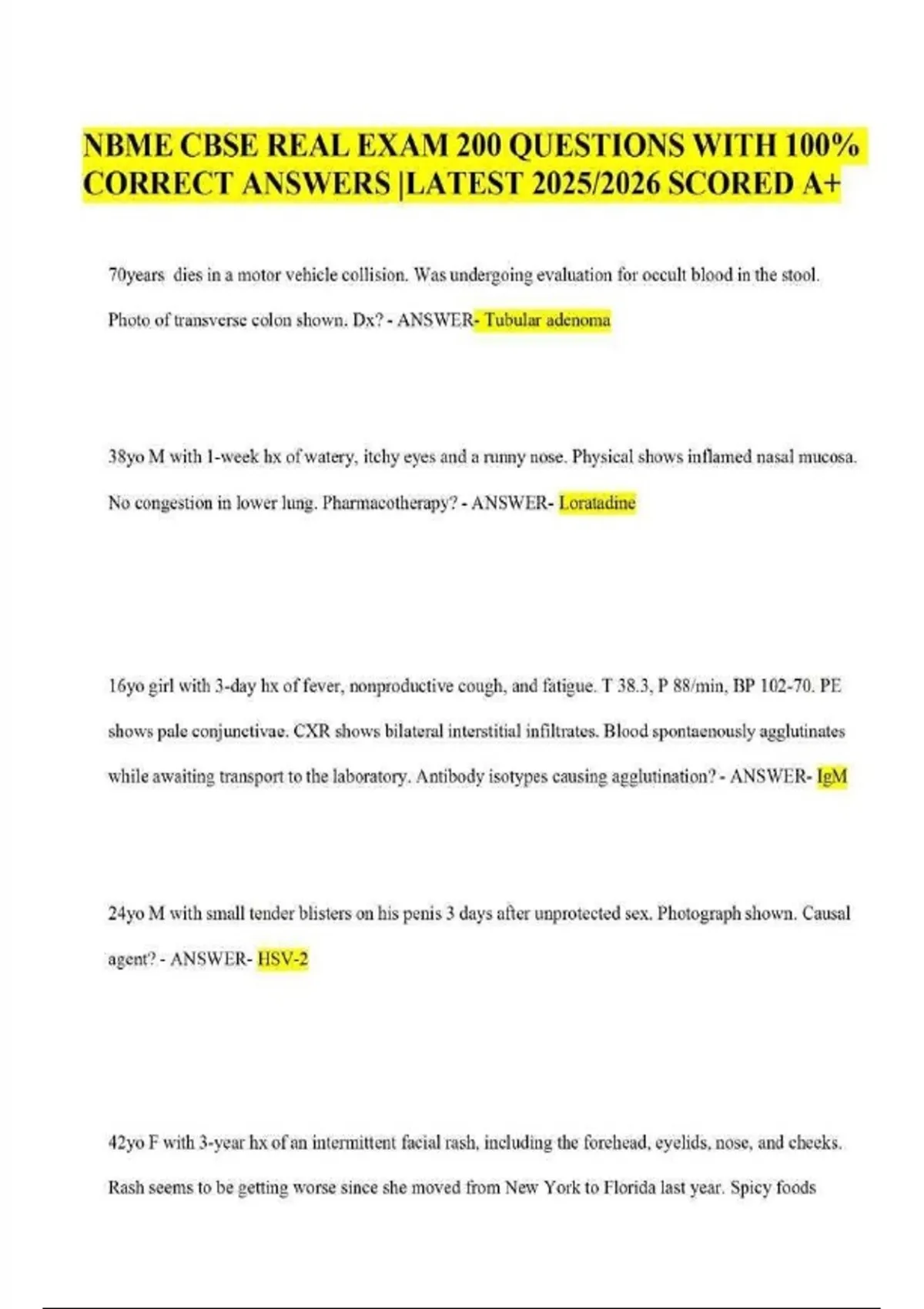 NBME CBSE 2025–2026 High-Yield Practice Exam (200 Questions) with Detailed Explanations Prepare to dominate your NBME CBSE exam with this comprehensive, high-yield 200-question practice exam designed specifically for medical students testing in 2025–2026. This product is built to reflect the style, difficulty, and topic distribution of the real NBME CBSE, without using or reproducing any copyrighted or leaked exam content. This is not a dump of real test questions — it is something better: a powerful exam-simulation system designed to help you score higher by training you the way NBME actually tests. What This Product Is This package contains: • 200 original, exam-style multiple-choice questions • Written to mirror NBME CBSE logic, wording, and difficulty • Fully updated for 2025–2026 USMLE-style standards • Detailed answer explanations for every question • High-yield learning points, buzzwords, and test-taking strategies Each question was written to test: • Clinical reasoning • Pathophysiology • Diagnosis • Next-best-step decision making • Management and prognosis Just like the real exam. What This Product Is NOT This is NOT: • Leaked NBME questions • Stolen exam files • Recalled memory dumps • Illegal material • Or a “guaranteed 100% score” scam Instead, this is what top-scoring students actually use: high-quality simulated exams that train the brain to think in NBME format. That’s what increases scores. Why This Works Most students fail the CBSE not because they don’t know medicine — but because they don’t know how NBME asks questions. NBME does not test memorization. They test: • Pattern recognition • Clinical reasoning • Elimination of wrong answers • Subtle clues in long stems This product is engineered specifically to build that skill. Every question is written using: • NBME-style stem length • NBME distractor design • NBME logic traps • NBME clue placement So when you sit for the real CBSE, the format feels familiar instead of intimidating. Content Coverage This 200-question exam covers all major CBSE domains: Internal Medicine • Cardiology • Pulmonology • Renal • GI • Endocrine • Hematology • Infectious disease Surgery • Trauma • GI surgery • Vascular • Post-op complications Pediatrics • Development • Congenital disorders • Pediatric infections OB/GYN • Pregnancy • Complications • Gynecologic disease Psychiatry • Mood disorders • Psychosis • Substance use Neurology • Stroke • Seizures • Neurodegenerative disease Pathology • Neoplasia • Inflammation • Genetic disorders Pharmacology • Mechanisms • Adverse effects • Contraindications Microbiology & Immunology • Bacteria • Viruses • Autoimmune disease Real Exam Simulation The exam is designed to be taken in: • One sitting like the real CBSE • Or broken into blocks Students use it to: • Identify weak areas • Practice endurance • Learn NBME logic • Improve score predictability Who This Is For This product is ideal for: • Medical students preparing for NBME CBSE • IMG students • USMLE Step 1 candidates • Students needing a passing CBSE score for rotations or graduation • Students retaking CBSE after failing If you want to stop guessing and start scoring, this is built for you. What You Will Gain After using this exam properly, you will: • Recognize NBME question patterns • Improve elimination strategy • Spot trick answers • Increase speed and accuracy • Reduce exam anxiety • Walk into CBSE with confidence Why Students Choose This Students choose this product because: It is updated for 2025–2026 It mirrors NBME style It teaches how to think, not just memorize It is safe and legal It actually improves scores Final Note If you are serious about passing the NBME CBSE, you don’t need stolen questions. You need realistic training. That’s exactly what this provides.