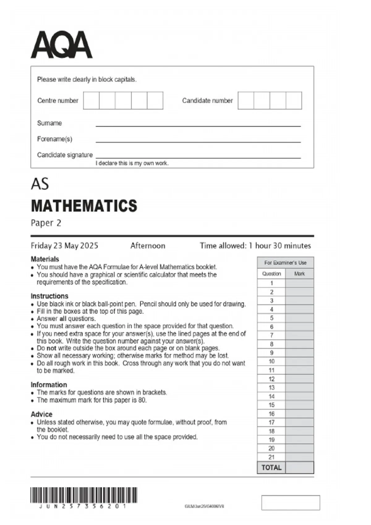 aqa as level mathematics paper 2 2025 exam merged mark scheme