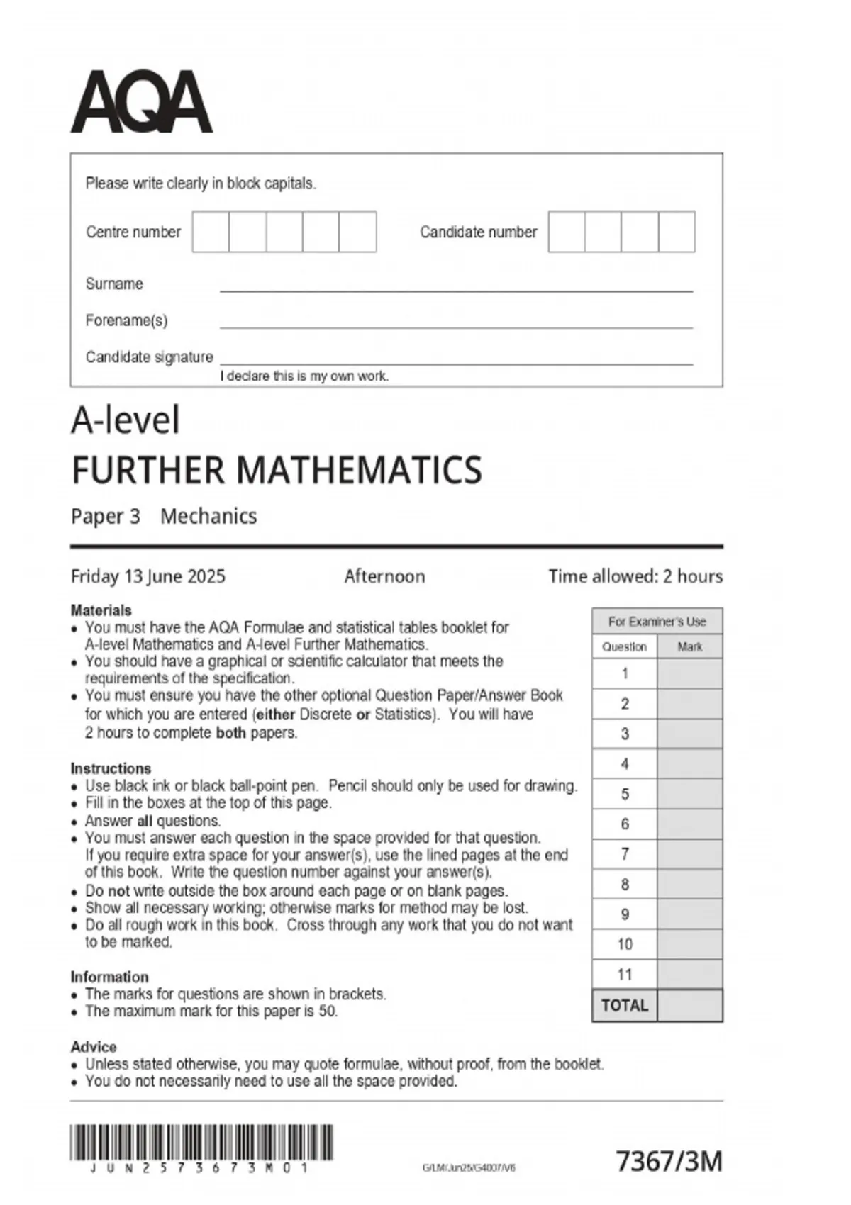 aqa a level further mathematics paper 3 mechanics 2025 exam merged mark scheme