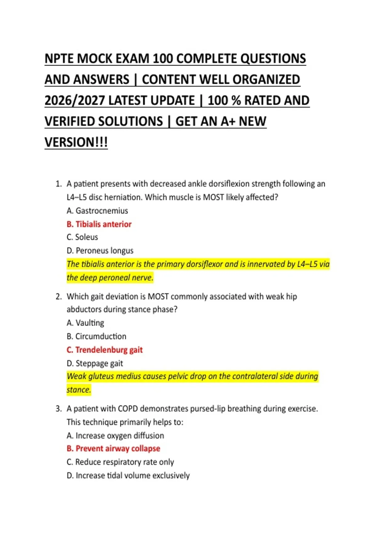 NPTE MOCK EXAM 100 COMPLETE QUESTIONS
