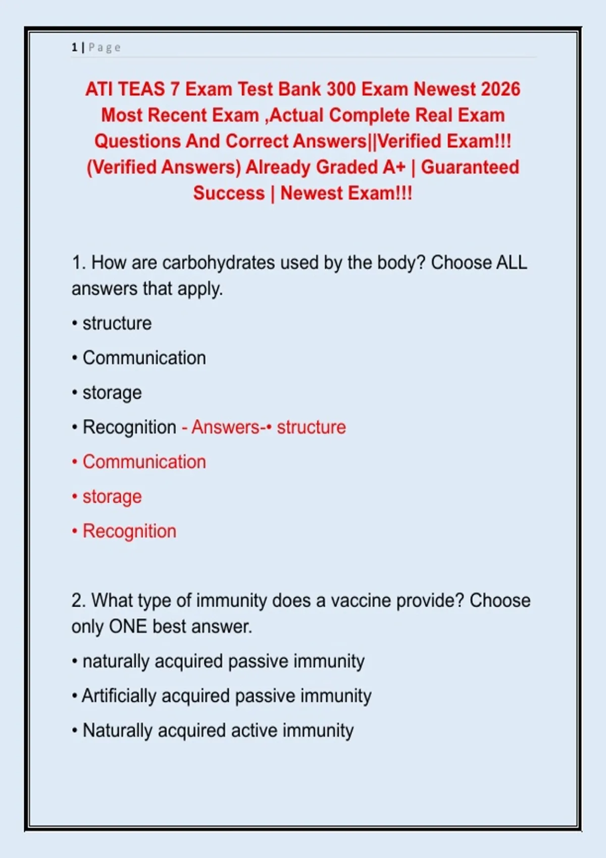 ATI TEAS 7 Exam Test Bank 300 Exam Newest 2026