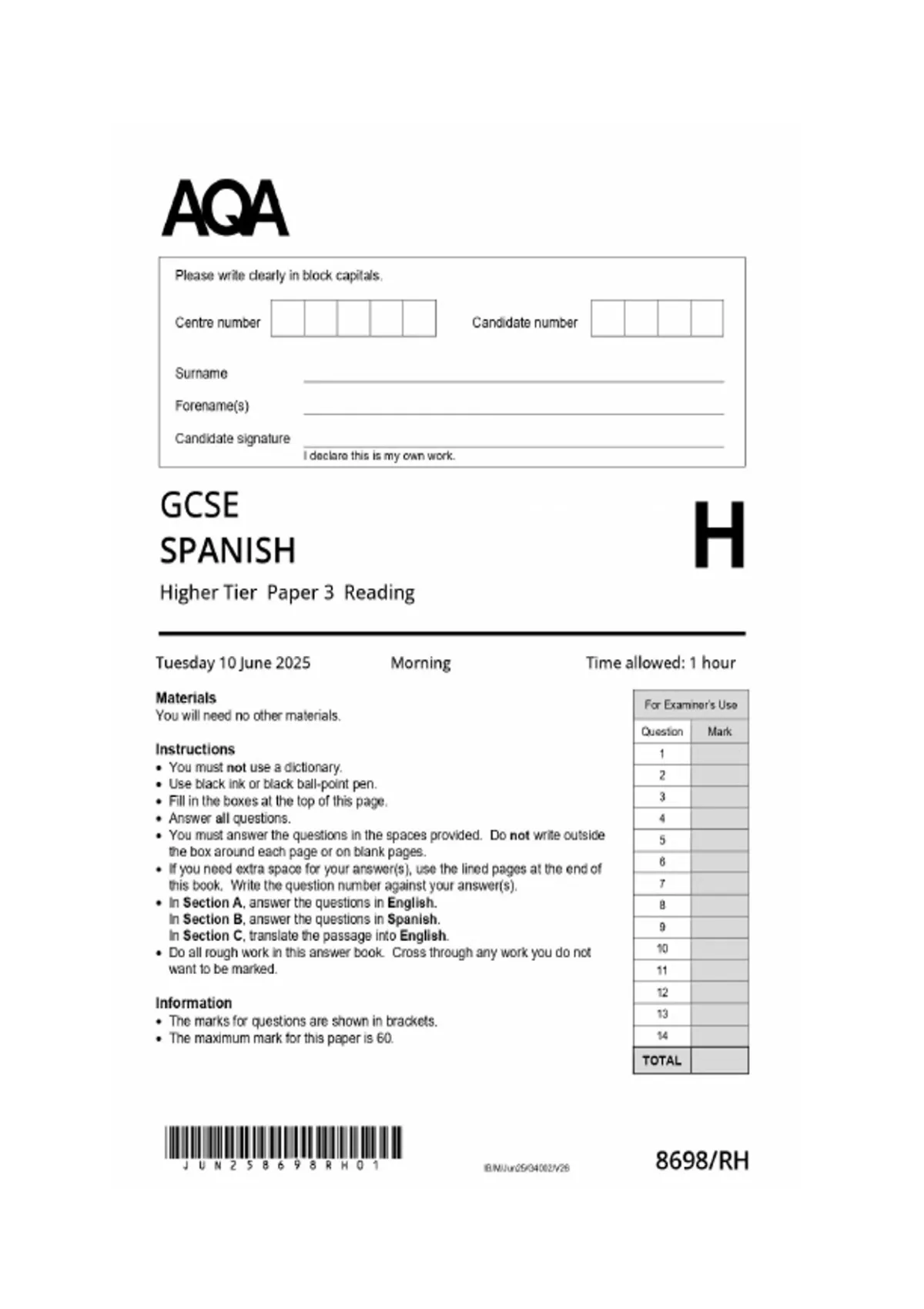GCSE AQA Spanish Higher Tier Paper 3 Reading – 2025 Exam merged with mark scheme