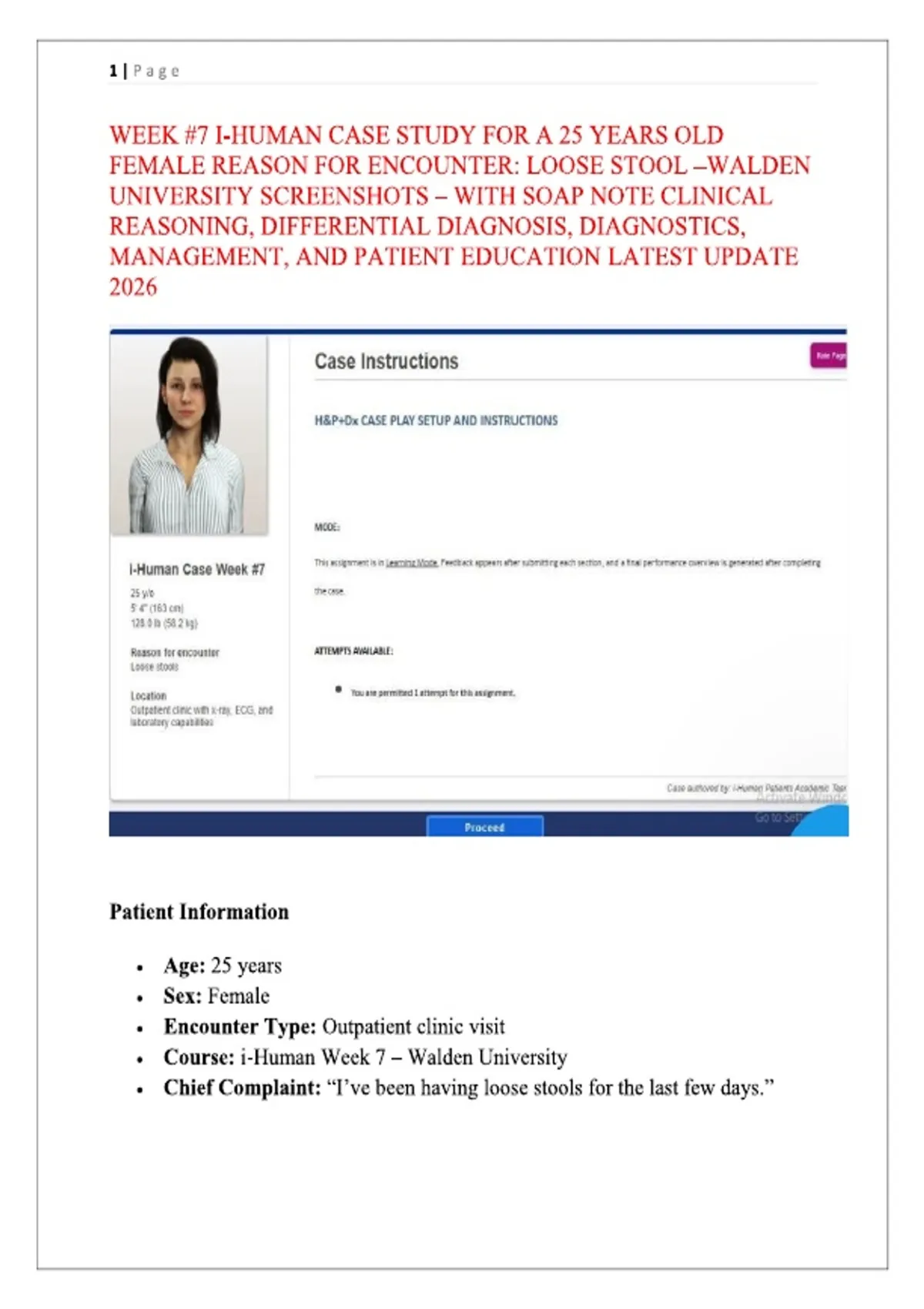 WEEK #7 I-HUMAN CASE STUDY FOR A 25 YEARS OLD FEMALE REASON FOR ENCOUNTER: LOOSE STOOL –WALDEN UNIVERSITY SCREENSHOTS – WITH SOAP NOTE CLINICAL REASONING, DIFFERENTIAL DIAGNOSIS, DIAGNOSTICS, MANAGEMENT, AND PATIENT EDUCATION LATEST UPDATE 2026