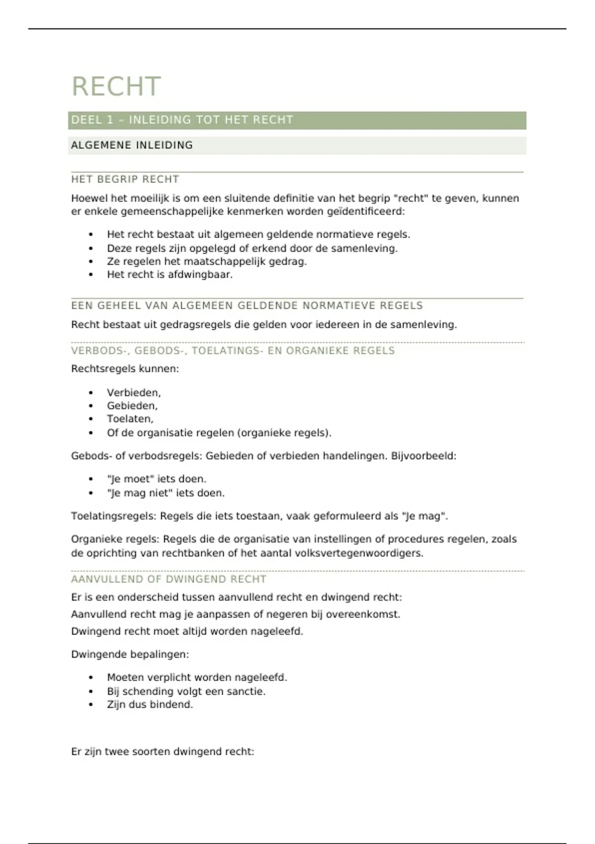 Deze volledige samenvatting van Inleiding tot het Recht biedt een duidelijk en gestructureerd overzicht van de belangrijkste juridische basisbegrippen. Het document is ideaal voor studenten die de leerstof snel willen begrijpen en zich efficiënt willen voorbereiden op examens, herexamens. De samenvatting behandelt onder andere het rechtssysteem, rechtsbronnen, rechtsregels, rechtssubjecten, rechtshandelingen, overeenkomsten, aansprakelijkheid en gerechtelijke procedures. Complexe juridische theorie wordt op een toegankelijke en overzichtelijke manier uitgelegd, met focus op wat écht belangrijk is voor het examen. Dankzij de logische opbouw en heldere uitleg krijg je snel inzicht in hoe het recht in de praktijk werkt en hoe juridische problemen worden geanalyseerd. Met deze samenvatting heb je alles wat je nodig hebt voor Inleiding tot het Recht overzichtelijk in één document.