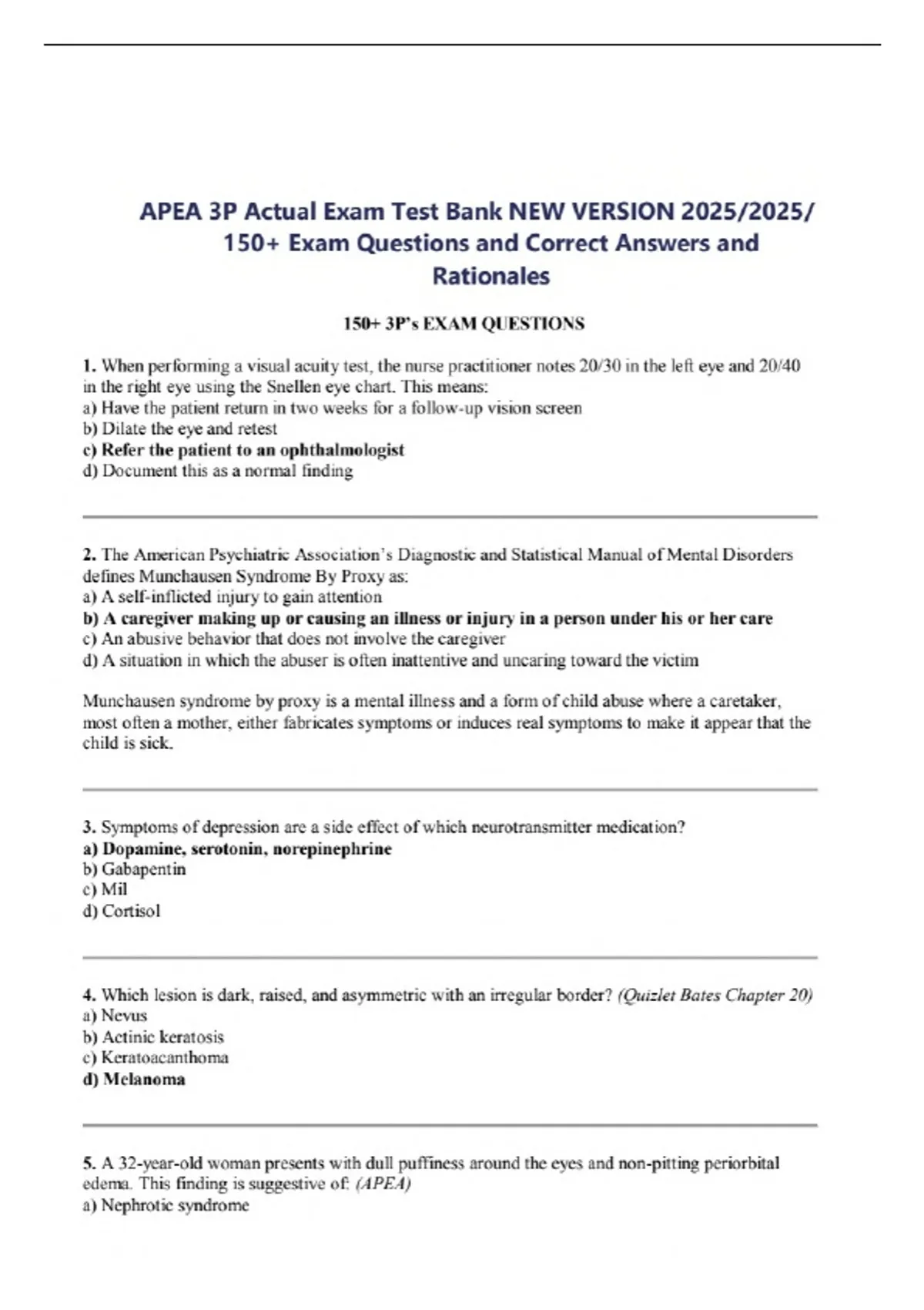 APEA 3P Actual Exam Test Bank – NEW VERSION (2025–2026) is a comprehensive and up-to-date exam preparation resource designed to help nurse practitioner students and candidates confidently pass the APEA 3P (Primary Care) examination. This test bank includes 150+ carefully selected exam-style questions aligned with the latest APEA 3P blueprint and exam trends for 2025–2026. Each question is accompanied by accurate, clearly explained answers to reinforce clinical reasoning, diagnostic skills, and evidence-based decision-making. The content covers all major primary care domains, including health assessment, diagnosis, management, pharmacology, health promotion, and disease prevention across the lifespan. Questions reflect real exam difficulty and wording, making this resource ideal for final revision, self-assessment, and exam readiness. Whether you are preparing for the APEA predictor exam or strengthening your primary care knowledge, this test bank serves as a reliable and efficient study companion.