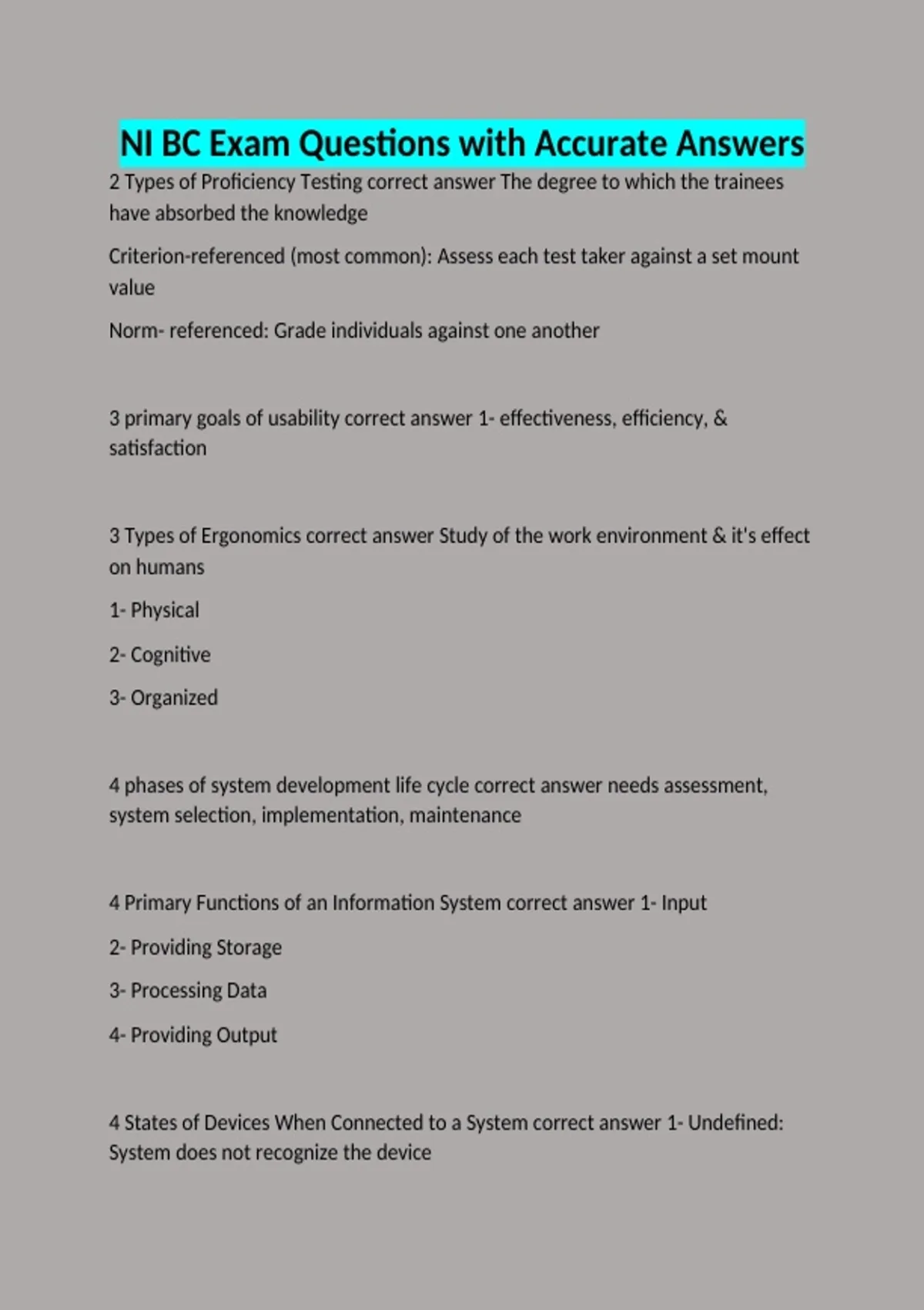 2 Types of Proficiency Testing correct answer The degree to which the trainees have absorbed the knowledge Criterion-referenced (most common): Assess each test taker against a set mount value Norm- referenced: Grade individuals against one another 3 primary goals of usability correct answer 1- effectiveness, efficiency, & satisfaction 3 Types of Ergonomics correct answer Study of the work environment & it's effect on humans 1- Physical 2- Cognitive 3- Organized 4 phases of system development life cycle correct answer needs assessment, system selection, implementation, maintenance 4 Primary Functions of an Information System correct answer 1- Input 2- Providing Storage 3- Processing Data 4- Providing Output 4 States of Devices When Connected to a System correct answer 1- Undefined: System does not recognize the device