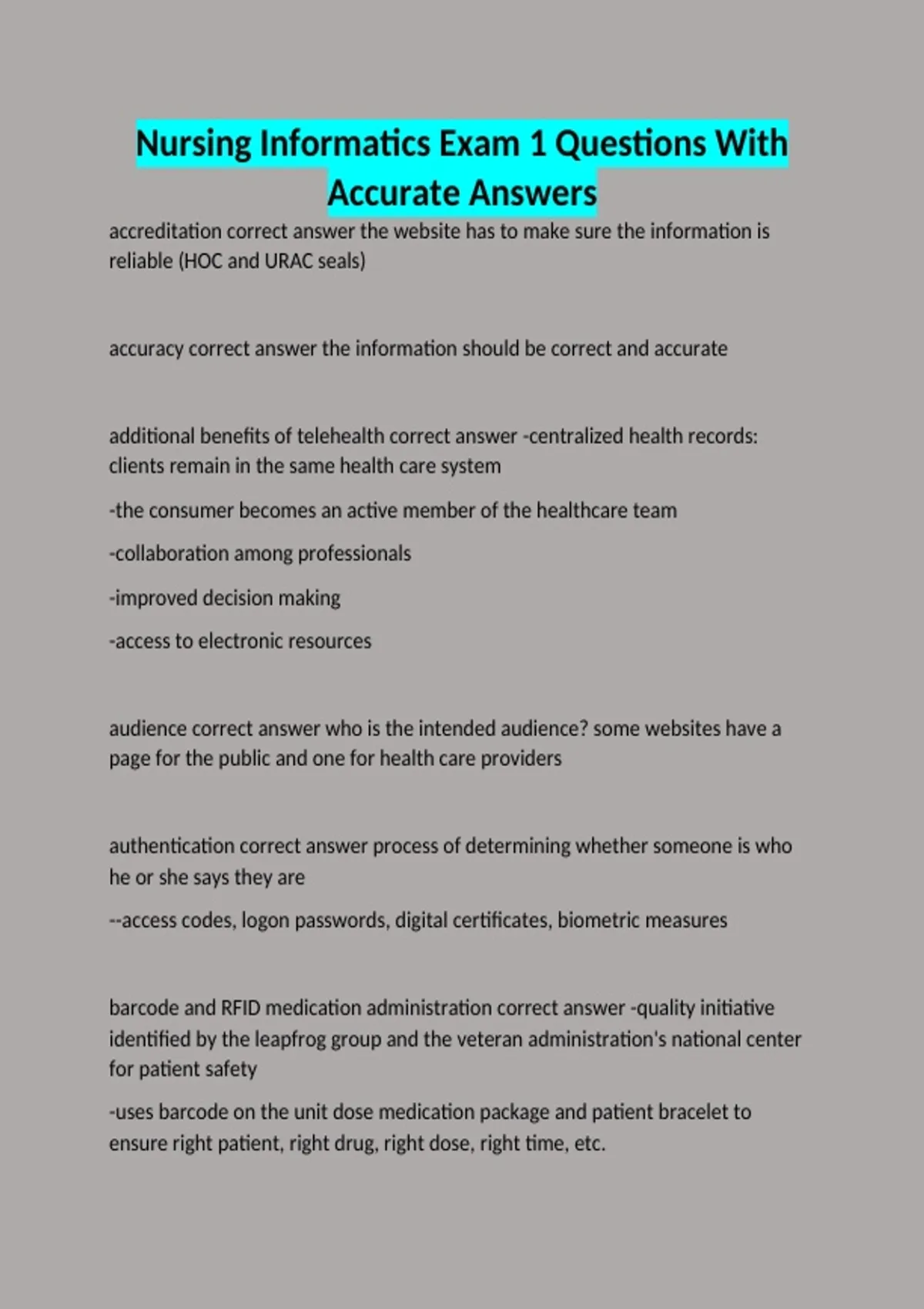 accreditation correct answer the website has to make sure the information is reliable (HOC and URAC seals) accuracy correct answer the information should be correct and accurate additional benefits of telehealth correct answer -centralized health records: clients remain in the same health care system -the consumer becomes an active member of the healthcare team -collaboration among professionals -improved decision making -access to electronic resources audience correct answer who is the intended audience? some websites have a page for the public and one for health care providers authentication correct answer process of determining whether someone is who he or she says they are --access codes, logon passwords, digital certificates, biometric measures barcode and RFID medication administration correct answer -quality initiative identified by the leapfrog group and the veteran administration's national center for patient safety -uses barcode on the unit dose medication package and patient bracelet to ensure right patient, right drug, right dose, right time, etc.