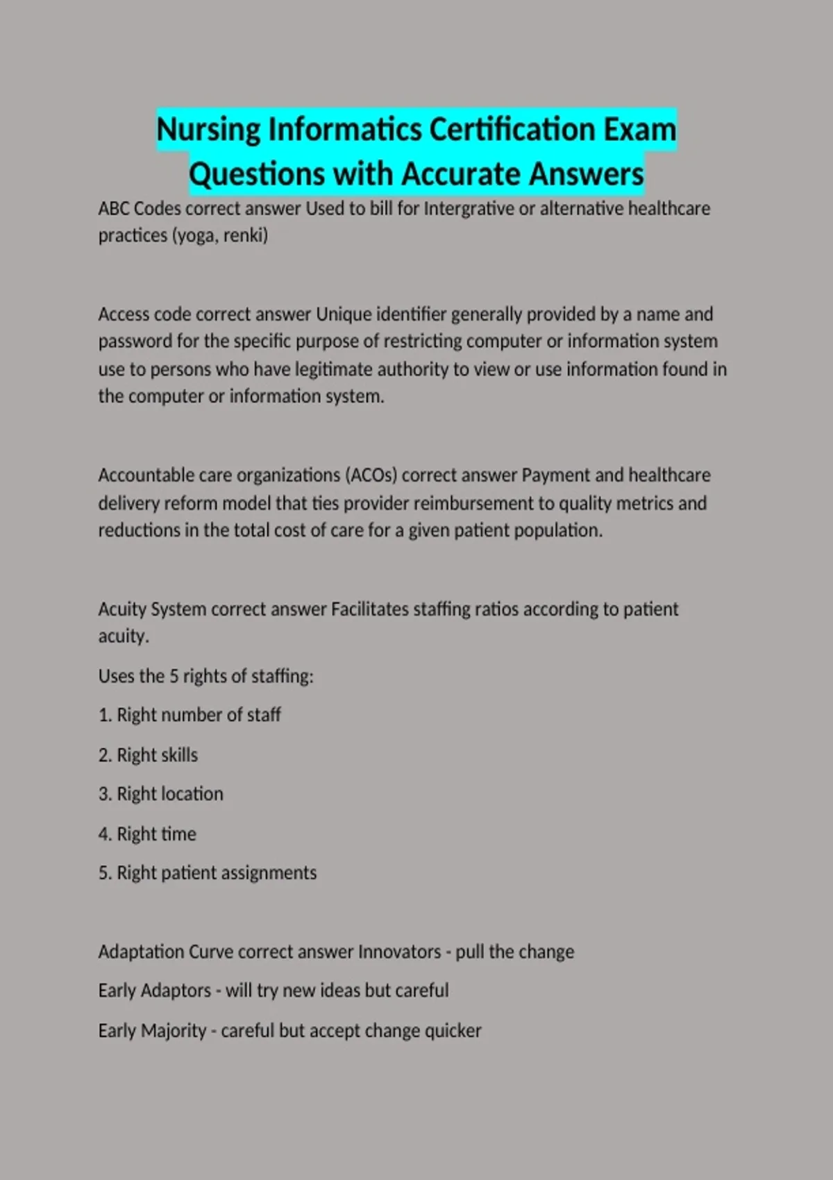 ABC Codes correct answer Used to bill for Intergrative or alternative healthcare practices (yoga, renki) Access code correct answer Unique identifier generally provided by a name and password for the specific purpose of restricting computer or information system use to persons who have legitimate authority to view or use information found in the computer or information system. Accountable care organizations (ACOs) correct answer Payment and healthcare delivery reform model that ties provider reimbursement to quality metrics and reductions in the total cost of care for a given patient population. Acuity System correct answer Facilitates staffing ratios according to patient acuity. Uses the 5 rights of staffing: 1. Right number of staff 2. Right skills 3. Right location 4. Right time 5. Right patient assignments Adaptation Curve correct answer Innovators - pull the change Early Adaptors - will try new ideas but careful Early Majority - careful but accept change quicker