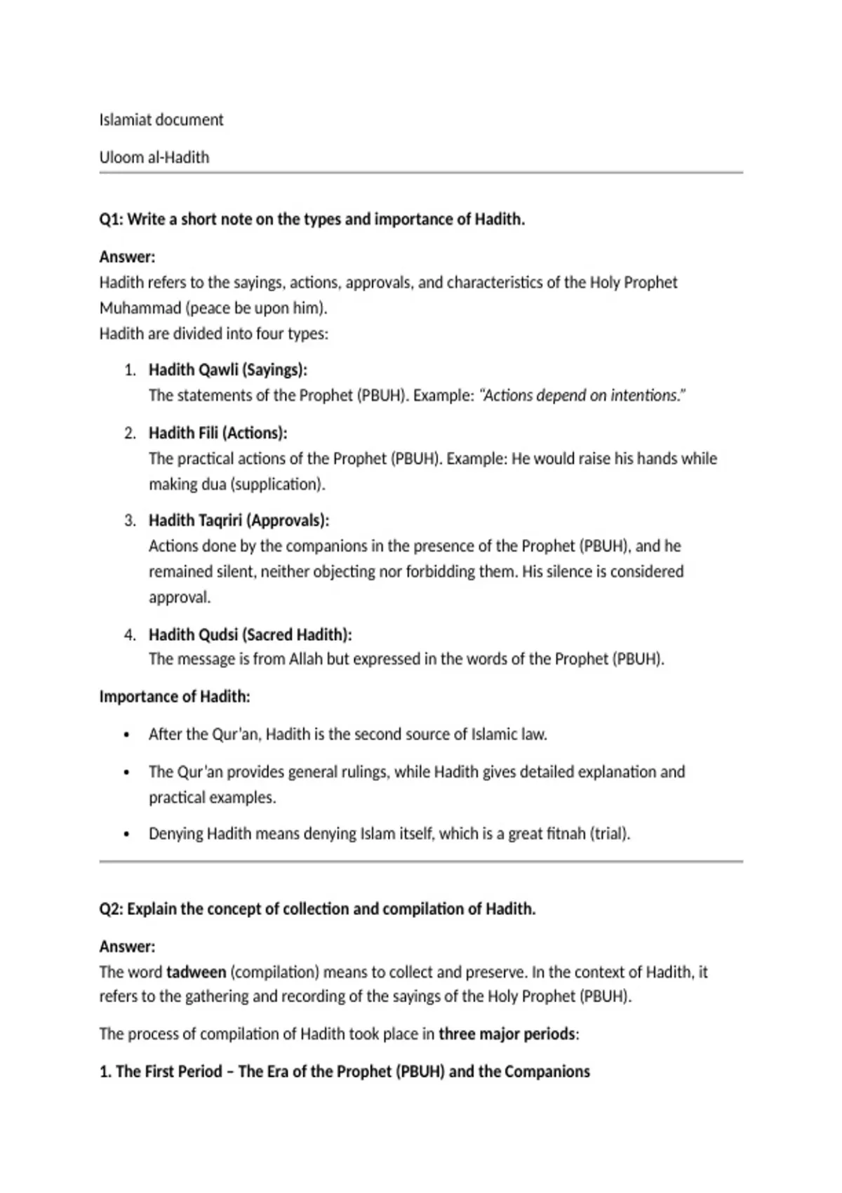 this document shows the history and the process of the compilation and preservation of the hadith. there are detailed structured answers with questions in a clear and simple manner. this document will help a student of any grade who want to seek knowledge about such subjects.