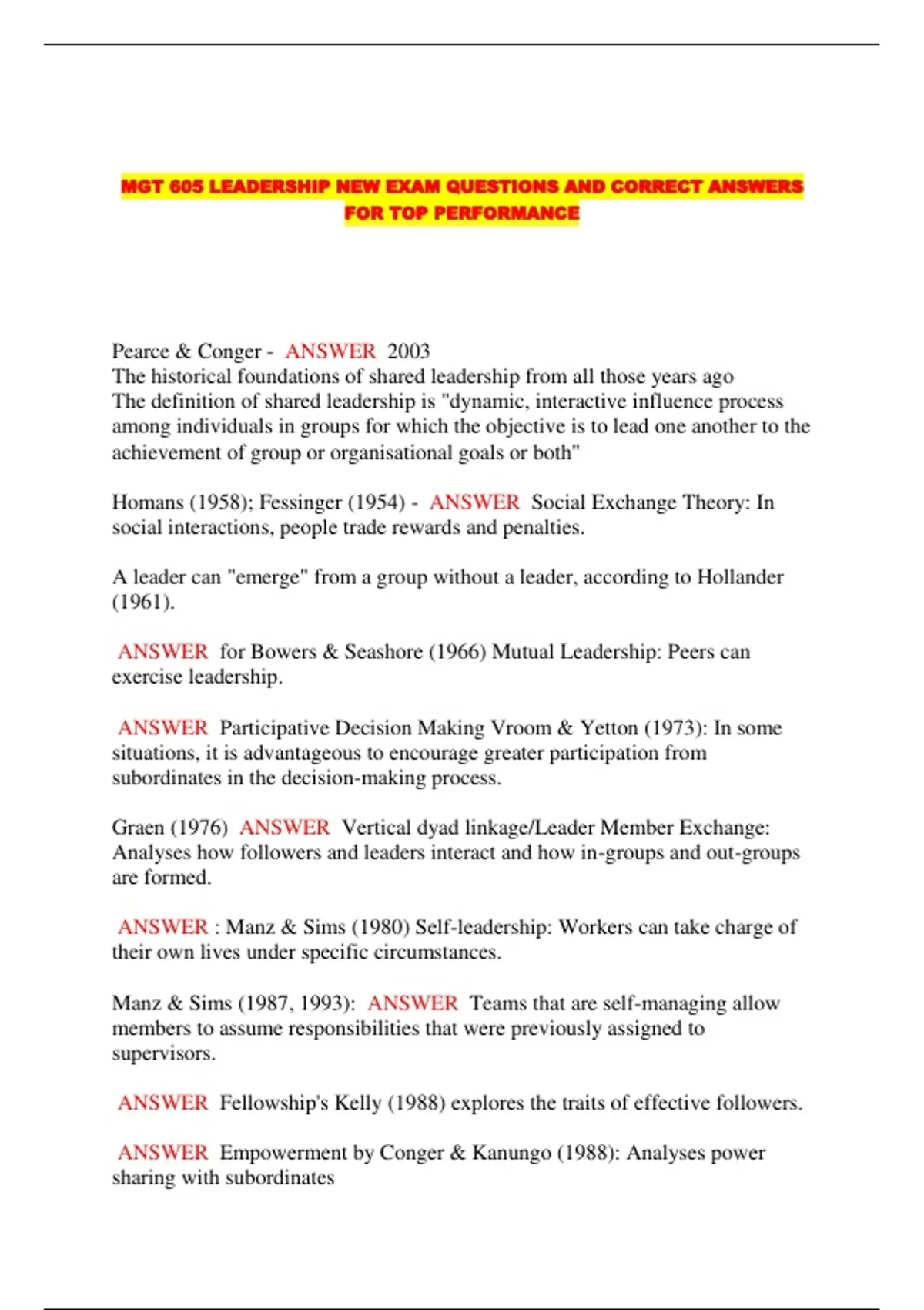 MGT 605 LEADERSHIP NEW EXAM QUESTIONS AND CORRECT ANSWERS