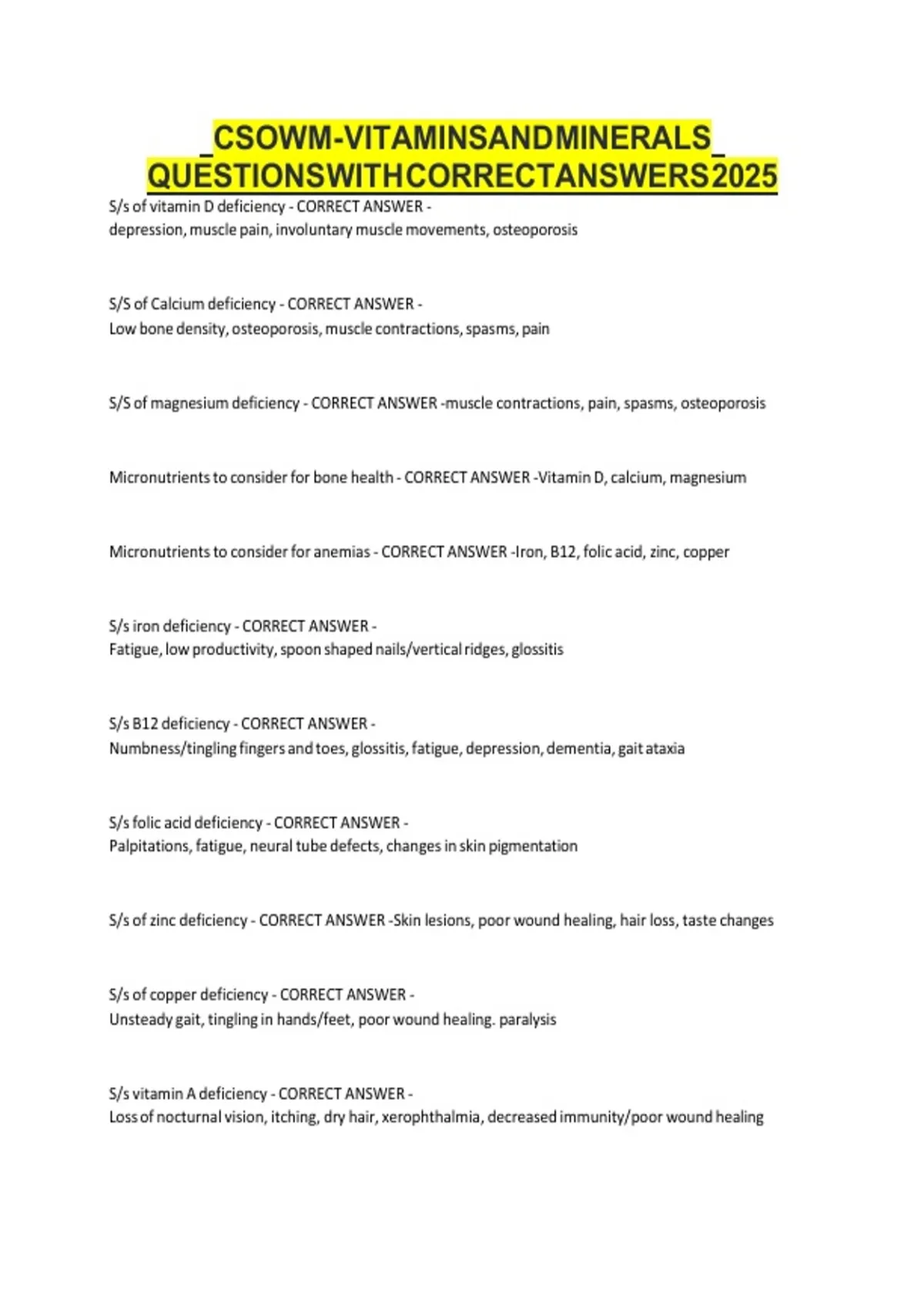 CSOWM - VITAMINS AND MINERALS QUESTIONS WITH CORRECT ANSWERS