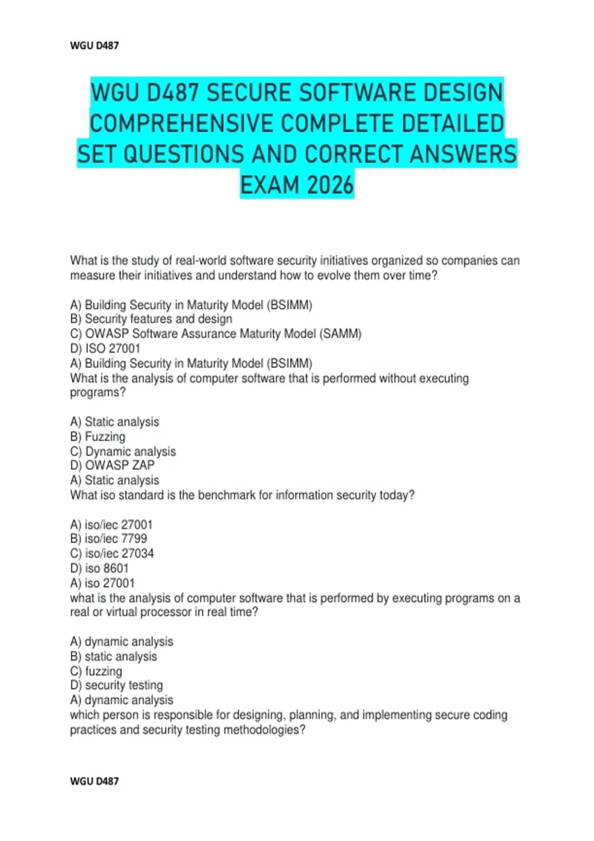 WGU D487 SECURE SOFTWARE DESIGN COMPREHENSIVE COMPLETE DETAILED SET QUESTIONS AND CORRECT ANSWERS EXAM 2026 What is the study of real-world software security initiatives organized so companies can measure their initiatives and understand how to evolve them over time? A) Building Security in Maturity Model (BSIMM) B) Security features and design C) OWASP Software Assurance Maturity Model (SAMM) D) ISO 27001 A) Building Security in Maturity Model (BSIMM) What is the analysis of computer software that is performed without executing programs? A) Static analysis B) Fuzzing C) Dynamic analysis D) OWASP ZAP A) Static analysis What iso standard is the benchmark for information security today? A) iso/iec 27001 B) iso/iec 7799 C) iso/iec 27034 D) iso 8601 A) iso 27001 what is the analysis of computer software that is performed by executing programs on a real or virtual processor in real time? A) dynamic analysis B) static analysis C) fuzzing D) security testing A) dynamic analysis which person is responsible for designing, planning, and implementing secure coding practices and security testing methodologies? WGU D487 WGU D487 A) software security architect B) product security developer C) software security champion D) software tester A) software security architect A company is preparing to add a new feature to its flagship software product. The new feature is similar to features that have been added in previous years, and the requirements are well-documented. The project is expected to last three to four months, at which time the new feature will be released to customers. Project team members will focus solely on the new feature until the project ends. Which software development methodology is being used? A) Waterfall B) Agile C) Scrum D) Extreme programming A) Waterfall A new product will require an administration section for a small number of users. Normal users will be able to view limited customer information and should not see admin functionality within the application. Which concept is being used? A) Principle of least privilege B) Privacy C) Software security champion D) Elevation of privilege A) Principle of least privilege The software security team is currently working to identify approaches for input validation, authentication, authorization, and configuration management of a new software product so they can deliver a security profile. Which threat modeling step is being described? A) Analyzing the target B) Drawing data flow diagram C) Rating threats D) Identifying and documenting threats A) Analyzing the target The scrum team is attending their morning meeting, which is scheduled at the beginning of the work day. Each team member reports what they accomplished yesterday, what they plan to accomplish today, and if they have any impediments that may cause them to miss their delivery deadline. Which scrum ceremony is the team participating in? WGU D487 WGU D487 A) Daily scrum B) Sprint review C) Sprint retrospective D) Sprint planning A) Daily scrum what is a list of information security vulnerabilities that aims to provide names for publicly known problems? A) common computer vulnerabilities and exposures (CVE) B) SANS institute top cyber security risks C) bugtraq D) Carnegie melon computer emergency readiness team (CERT) A) common computer vulnerabilities and exposures (CVE) which secure coding best practice uses well-tested, publicly available algorithms to hide product data from unauthorized access? A) access control B) authentication and password management C) cryptographic practices D) data protection C) cryptographic practices which secure coding best practice ensures servers, frameworks, and system components are all running the latest approved versions? A) file management B) input validation C) database security D) system configuration D) system configuration Which secure coding best practice says to use parameterized queries, encrypted connection strings stored in separate configuration files, and strong passwords or multi factor authentication? A) access control B) database security C) file management D) session management B) database security which secure coding best practice says that all information passed to other systems should be encrypted? A) output encoding B) memory management C) communication security D) database security C) communication security WGU D487 WGU D487 Team members are being introduced during sprint zero in the project kickoff meeting. The person being introduced is a member of the scrum team, responsible for writing feature logic and attending sprint ceremonies. Which role is the team member playing? A) Software developer B) Product owner C) Scrum master D) Quality assurance analyst A) Software developer A software security team member has created data flow diagrams, chosen the STRIDE methodology to perform threat reviews, and created the security assessment for the new product. Which category of secure software best practices did the team member perform? A) Architecture analysis B) Training C) Penetration testing D) Code review A) Architecture analysis A company is preparing to add a new feature to its flagship software product. The new feature is similar to features that have been added in previous years, and the requirements are well-documented. The project is expected to last three to four months, at which time the new feature will be released to customers. Project team members will focus solely on the new feature until the project ends. Which software development methodology is being used? A) Agile B) Waterfall C) Scrum D) Extreme programming B) Waterfall A new product will require an administration section for a small number of users. Normal users will be able to view limited customer information and should not see admin functionality within the application. Which concept is being used? A) privacy B) POLP C) software security champion D) elevation of privilege B) POLP The software security team is currently working to identify approaches for input