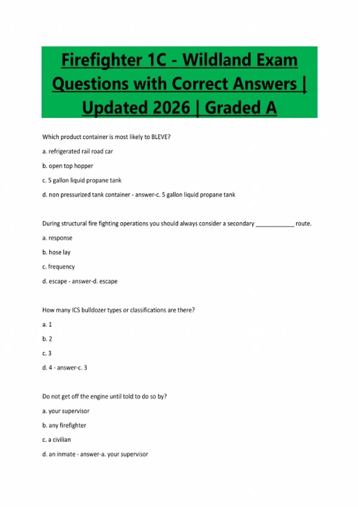 Firefighter 1C - Wildland Exam Questions with Correct Answers | Updated 2026 | Graded A Which product container is most likely to BLEVE? a. refrigerated rail road car b. open top hopper c. 5 gallon liquid propane tank d. non pressurized tank container - answer-c. 5 gallon liquid propane tank During structural fire fighting operations you should always consider a secondary ____________ route. a. response b. hose lay c. frequency d. escape - answer-d. escape How many ICS bulldozer types or classifications are there? a. 1 b. 2 c. 3 d. 4 - answer-c. 3 Do not get off the engine until told to do so by? a. your supervisor b. any firefighter c. a civilian d. an inmate - answer-a. your supervisorName advantages in using the indirect attack method of wildland fire fighting: a. firefighters subjected to less heat and smoke b. burning can get out of control, sacrifice acreage c. firefighters working in unburned fuel can be overrun d. acreage burned is increased - answer-a. firefighters subjected to less heat and smoke You should always carry a McLeod on the downhill side at balance point with tines pointed down with the handle of the McLeod parallel to the earth's surface. a. True b. False - answer-b. False Note: you want to carry it the same but the tines pointed up as the cutting edge is always pointed down/away from your body. When your fireline is completed to a natural or constructed barrier, or another fire line, you have reached a: a. flank b. tie-in c. slop over d. island - answer-b. tie-in There are ________________________ basic attack methods used on wildland fires. a. one b. two c. three d. four - answer-c. three Note: direct attack, indirect attack, parallel attack