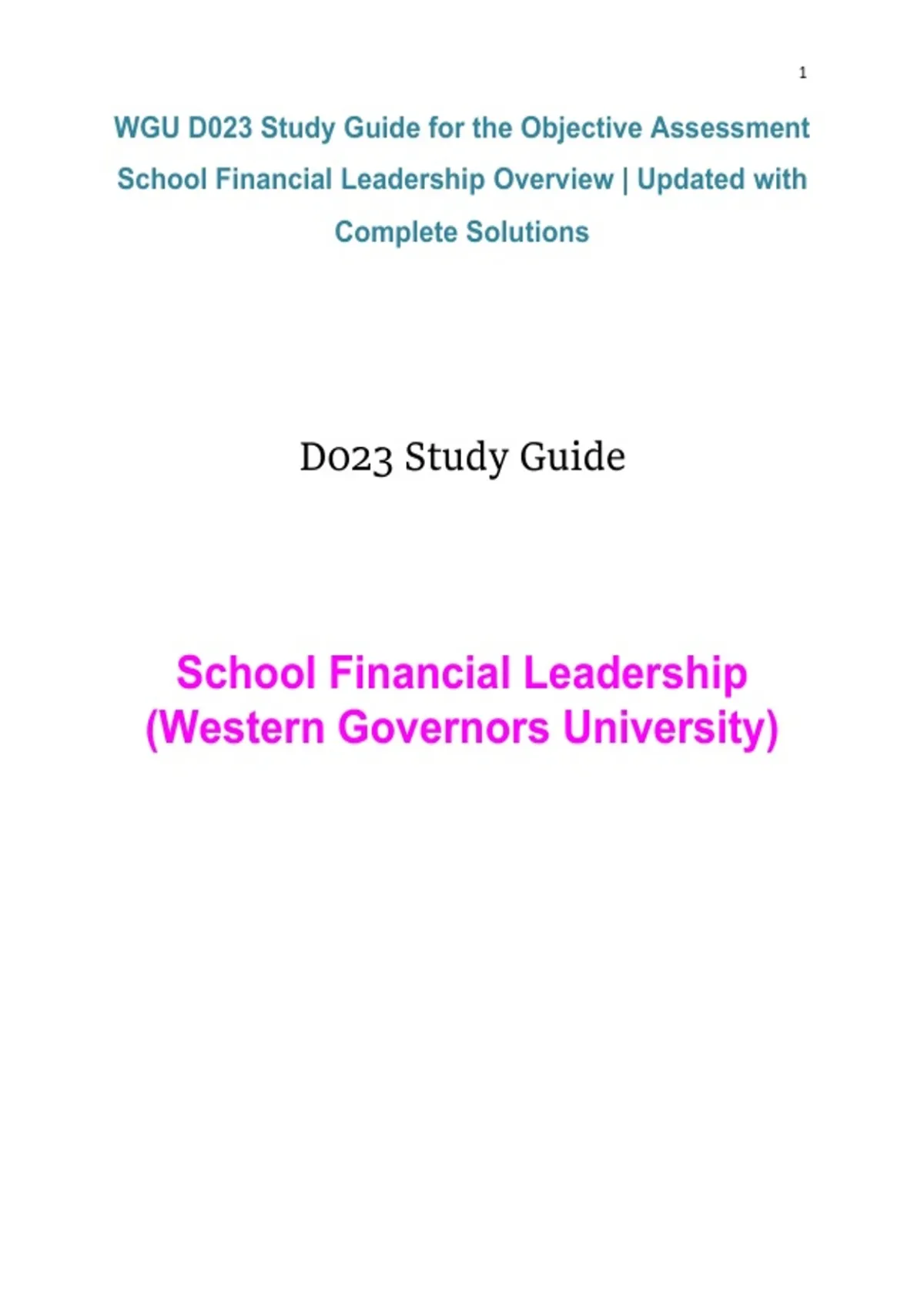 This study guide provides a structured overview of the WGU D023 Objective Assessment, focusing on school financial leadership principles and decision-making in educational settings. It covers key topics such as budgeting models, financial accountability, funding sources, resource allocation, legal and ethical considerations, and data-informed financial planning. The content is aligned with updated WGU course competencies for the 2026/2027 academic period and is designed to support effective preparation and conceptual mastery.