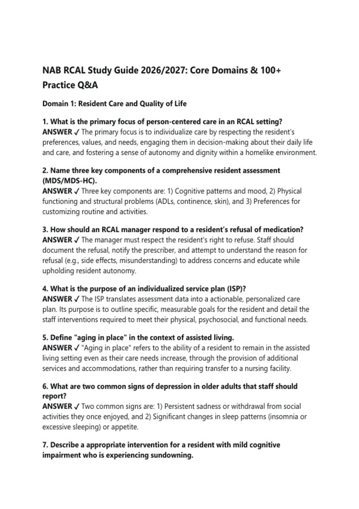 NAB RCAL Study Guide 2026/2027: Core Domains & 100+ Practice Q&A Domain 1: Resident Care and Quality of Life 1. What is the primary focus of person-centered care in an RCAL setting? ANSWER The primary focus is to individualize care by respecting the resident’s preferences, values, and needs, engaging them in decision-making about their daily life and care, and fostering a sense of autonomy and dignity within a homelike environment. 2. Name three key components of a comprehensive resident assessment (MDS/MDS-HC). ANSWER Three key components are: 1) Cognitive patterns and mood, 2) Physical functioning and structural problems (ADLs, continence, skin), and 3) Preferences for customizing routine and activities. 3. How should an RCAL manager respond to a resident’s refusal of medication? ANSWER The manager must respect the resident's right to refuse. Staff should document the refusal, notify the prescriber, and attempt to understand the reason for refusal (e.g., side effects, misunderstanding) to address concerns and educate while upholding resident autonomy. 4. What is the purpose of an individualized service plan (ISP)? ANSWER The ISP translates assessment data into a actionable, personalized care plan. Its purpose is to outline specific, measurable goals for the resident and detail the staff interventions required to meet their physical, psychosocial, and functional needs. 5. Define "aging in place" in the context of assisted living. ANSWER "Aging in place" refers to the ability of a resident to remain in the assisted living setting even as their care needs increase, through the provision of additional services and accommodations, rather than requiring transfer to a nursing facility. 6. What are two common signs of depression in older adults that staff should report? ANSWER Two common signs are: 1) Persistent sadness or withdrawal from social activities they once enjoyed, and 2) Significant changes in sleep patterns (insomnia or excessive sleeping) or appetite. 7. Describe a appropriate intervention for a resident with mild cognitive impairment who is experiencing sundowning. ANSWER Maintain a consistent daily routine. In the late afternoon, increase calming activities, ensure adequate lighting to reduce shadows, and minimize noise and chaos. A gentle walk or familiar music can be soothing. 8. Why is promoting continence important, even when residents use briefs? ANSWER Promoting continence preserves dignity, reduces risk of skin breakdown and UTIs, and maintains higher levels of resident mobility and independence. It is a proactive, person-centered approach versus solely a containment strategy. 9. What is the role of activities in supporting quality of life for residents with dementia? ANSWER Meaningful, failure-free activities reduce agitation, provide a sense of purpose and accomplishment, stimulate preserved abilities, and offer positive ways to connect with others, thereby enhancing overall well-being. 10. How can staff support a resident's spiritual needs? ANSWER Staff can support spiritual needs by facilitating attendance at services, providing private space for prayer/meditation, arranging visits from clergy, and simply engaging in respectful conversations about the resident's beliefs and values. Domain 2: Human Resources & Staff Management 11. What are three critical elements to include in a staff orientation program for new RCAL aides? ANSWER 1) Facility philosophy of person-centered care, 2) Emergency procedures and safety protocols (fire, elopement), and 3) Hands-on training in communication techniques and assistance with ADLs respecting dignity. 12. A long-time employee is consistently 5-10 minutes late for their shift. What is the manager's first step? ANSWER The manager's first step is to have a private, non-confrontational conversation to explore the reason for the tardiness, reaffirm schedule exp