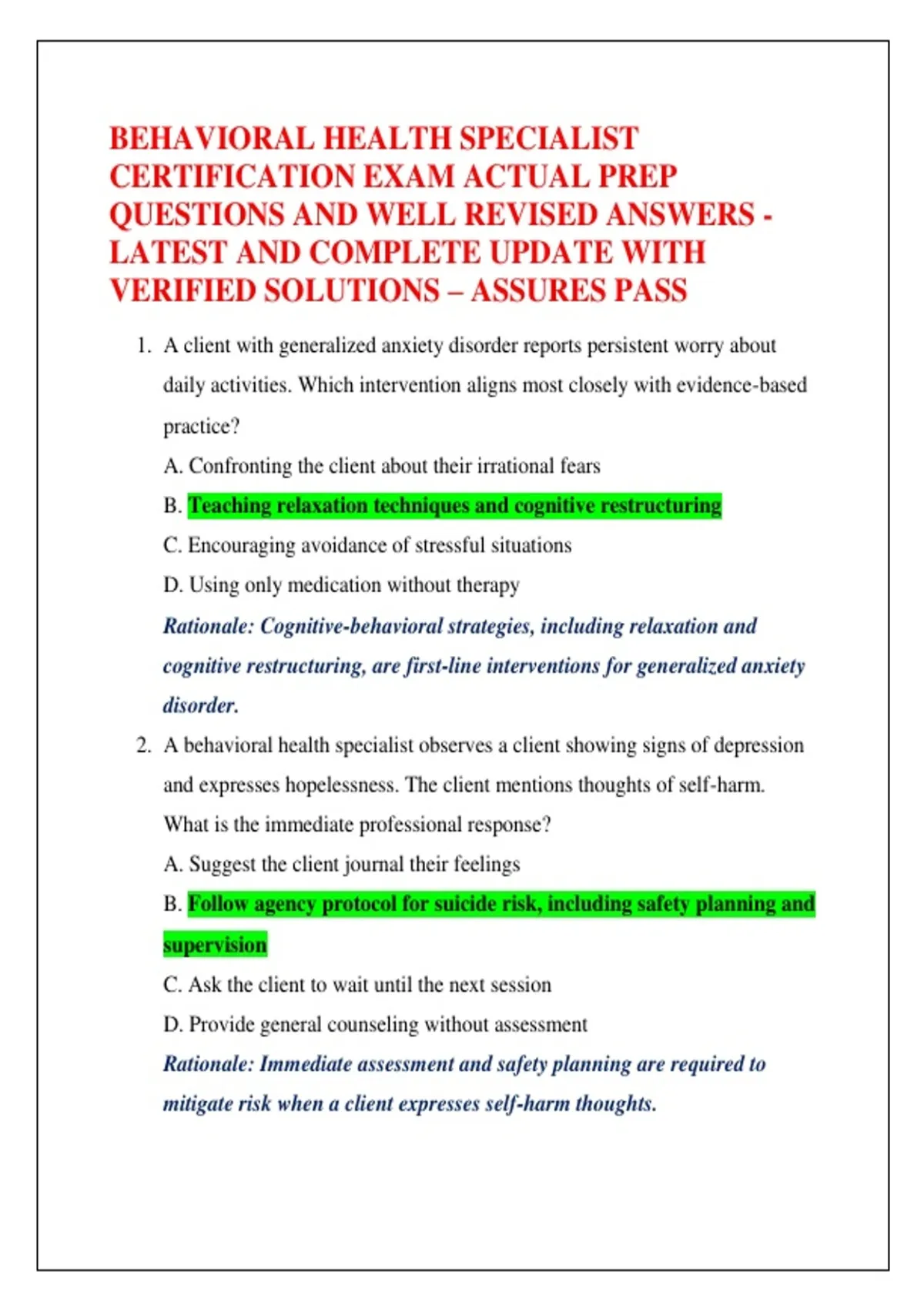 BEHAVIORAL HEALTH SPECIALIST CERTIFICATION EXAM ACTUAL PREP QUESTIONS AND WELL REVISED ANSWERS - LATEST AND COMPLETE UPDATE WITH VERIFIED SOLUTIONS – ASSURES PASS