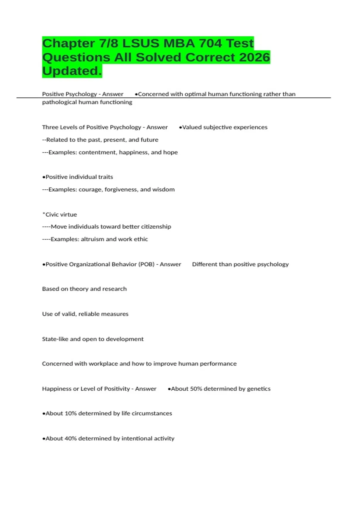 Positive Psychology - Answer •Concerned with optimal human functioning rather than pathological human functioning Three Levels of Positive Psychology - Answer •Valued subjective experiences --Related to the past, present, and future ---Examples: contentment, happiness, and hope •Positive individual traits ---Examples: courage, forgiveness, and wisdom *Civic virtue ----Move individuals toward better citizenship ----Examples: altruism and work ethic •Positive Organizational Behavior (POB) - Answer Different than positive psychology Based on theory and research Use of valid, reliable measures State-like and open to development Concerned with workplace and how to improve human performance Happiness or Level of Positivity - Answer •About 50% determined by genetics •About 10% determined by life circumstances •About 40% determined by intentional activity