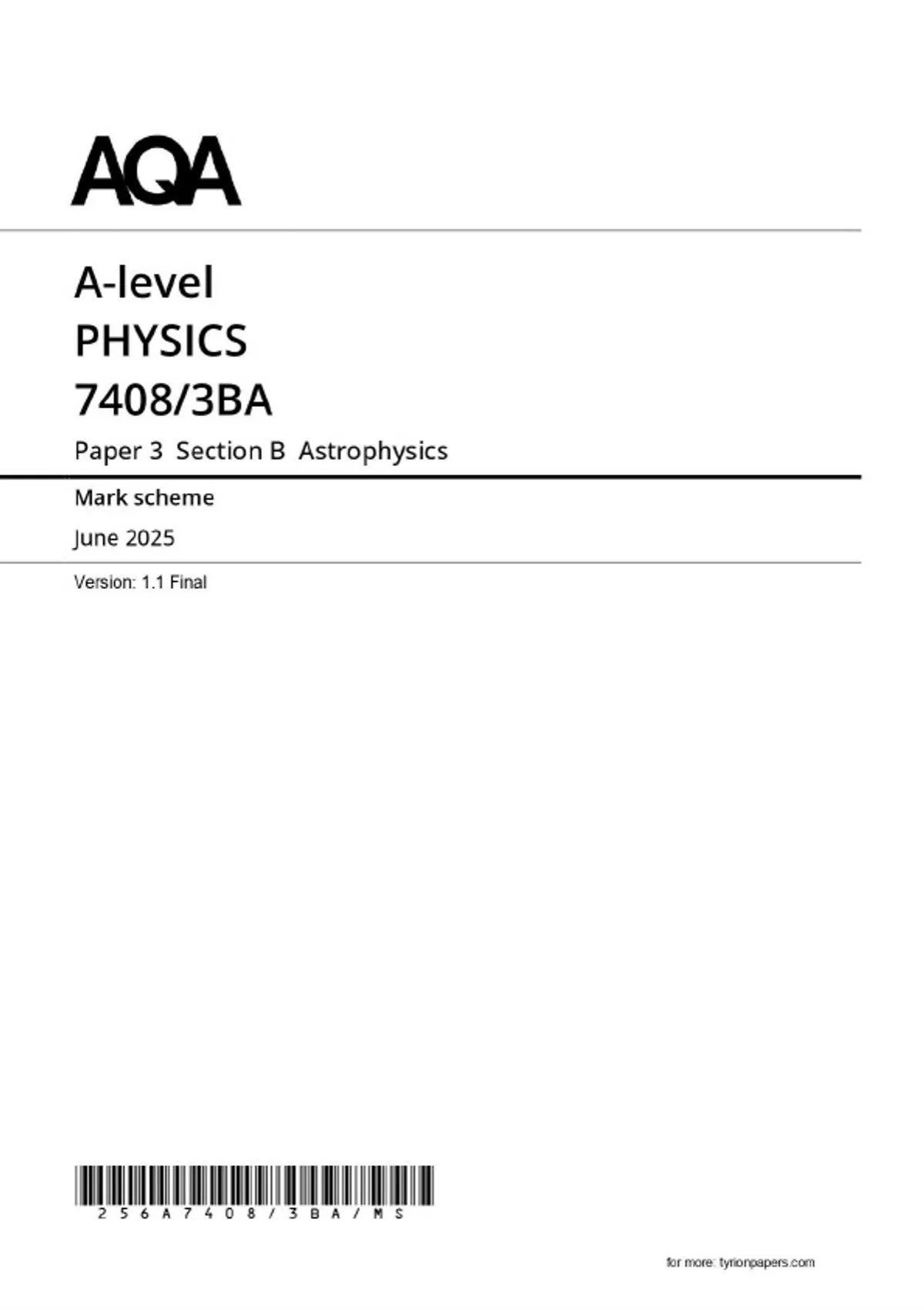 A-Level AQA 2025 Physics Paper 3 Section B Astrophysics Mark Scheme
