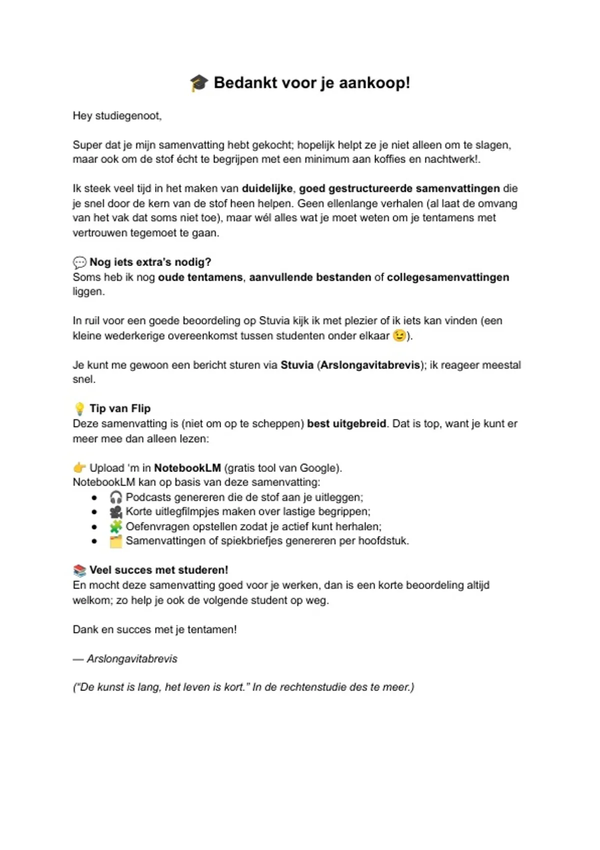 Je kunt me gewoon een bericht sturen via Stuvia (Arslongavitabrevis); ik reageer meestal