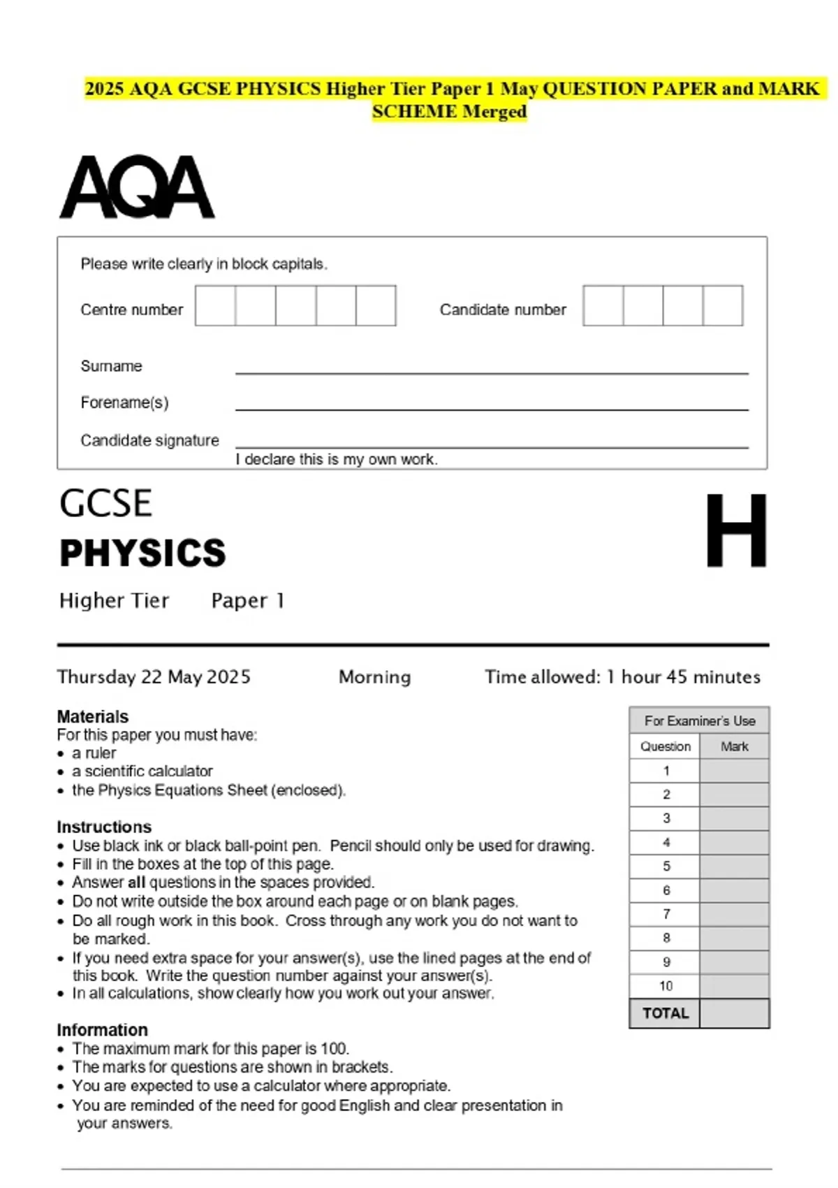 2025 AQA GCSE PHYSICS Higher Tier Paper 1 May QUESTION PAPER and MARK SCHEME Merged