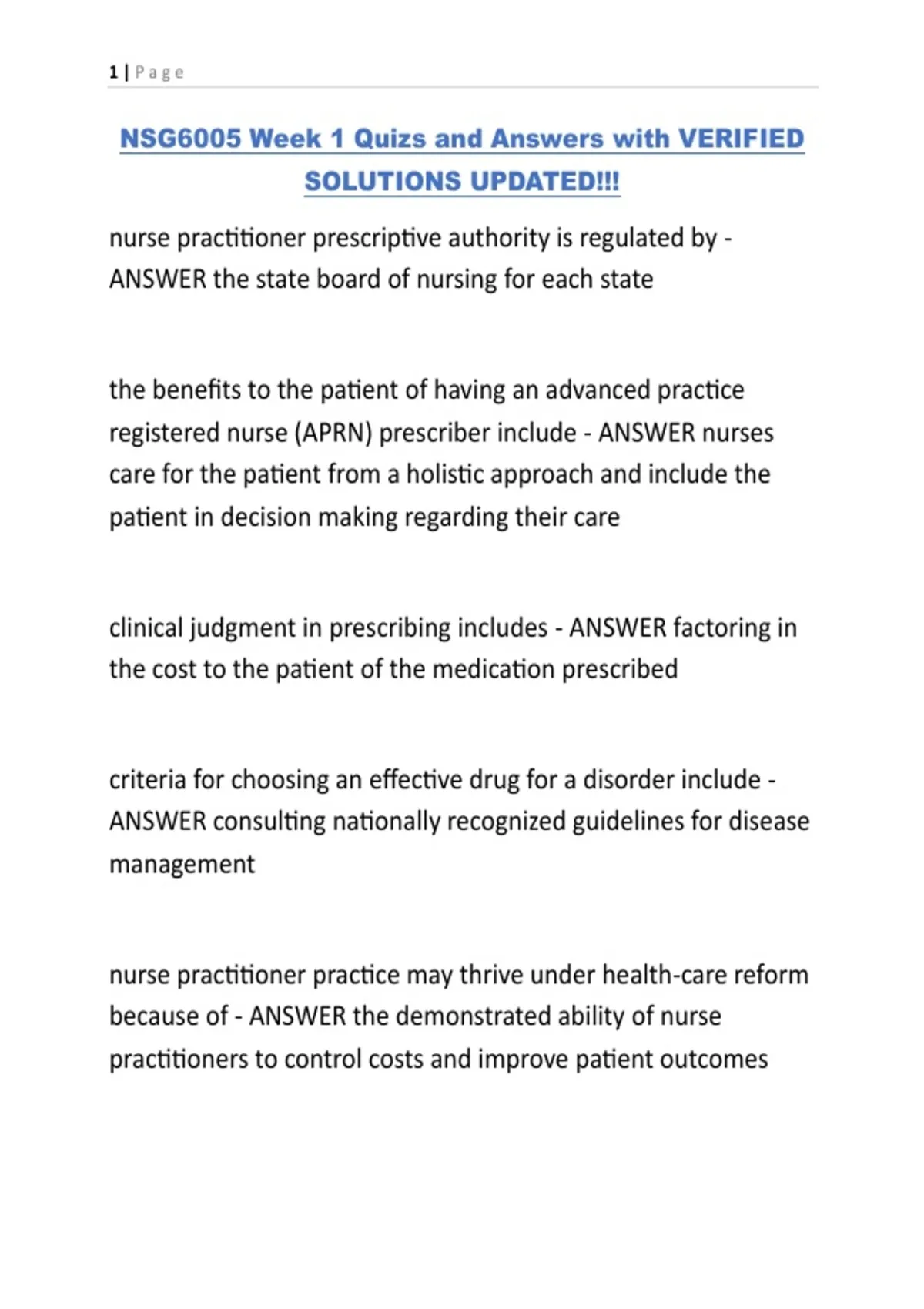 NSG6005 Week 1 Quizs and Answers with VERIFIED