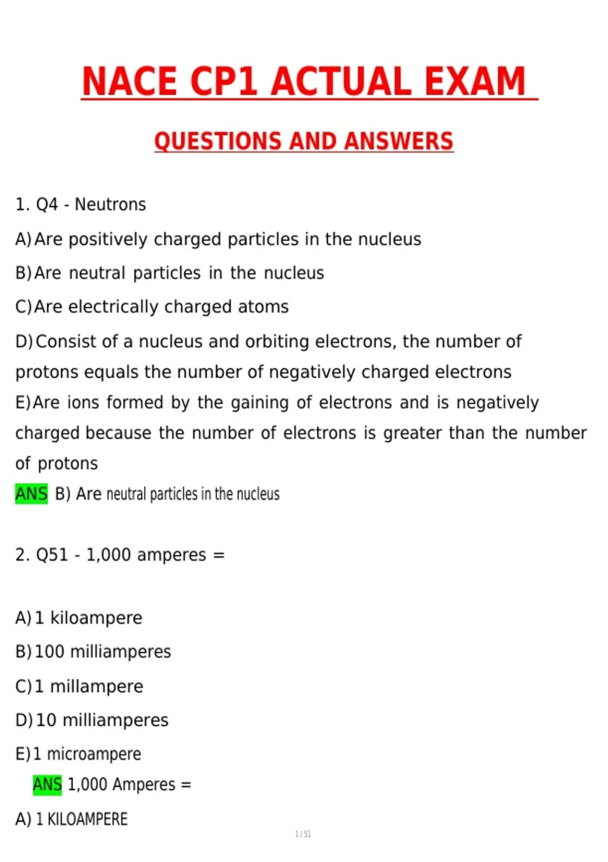 NACE CP1 EXAM Latest 2026 | Questions with 100% Correct Answers Complete | Updated 2026 / 2027 Verified by Experts NACE CP1 EXAM Latest 2026 Actual Questions & Verified Answers (2026 / 2027) A+ Grade 100% Guarantee Verified by Experts. NACE CP1 practice quizzes with verified answers 2026. Latest NACE CP2 study guide for guaranteed pass 2026. NACE CP3 Chpt 1 Mechanisms of Corrosion exam prep. Updated NACE CP1 tester certification questions . NACE CP2 Test 1 sample questions with explanations. NACE CP1 exam dumps with 100% pass rate 2025. NACE CP2 study materials for A+ grade 2026. NACE CP3 corrosion mechanisms practice test. NACE CP1 practical exam tips and tricks 2025. NACE CP2 Test 1 actual exam questions and answers. NACE CP3 Chapter 1 study guide with verified solutions. NACE CP1 tester certification exam preparation 2026. NACE CP2 Test 1 graded practice exam with feedback. NACE CP3 Mechanisms of Corrosion quiz bank. NACE CP1 exam simulator with real-time grading 2025. NACE CP2 study guide with updated content for 2026. NACE CP3 Chapter 1 interactive learning materials. NACE CP1 practical exam strategies for success. NACE CP2 Test 1 online practice with instant results NACE CIP Exam Prep Pack for 2026–2027 covers NACE CIP Level 1 (CP1) and Level 2 (CP2) with actual exam-style questions, CBT practice quizzes, and verified correct answers. Includes NACE CIP 1 CBT exam questions, PN-RN content, CP1 quizzes, practical exam prep, and CP2 exam review. Ideal for coating inspectors preparing for certification, recertification, or advancement. Designed to reinforce standards, inspection procedures, safety, and coating fundamentals. Instant PDF download for immediate access.