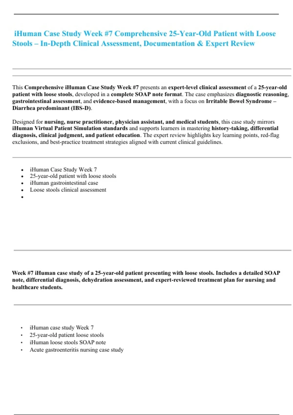 This Comprehensive iHuman Case Study Week #7 presents an expert-level clinical assessment of a 25-year-old
