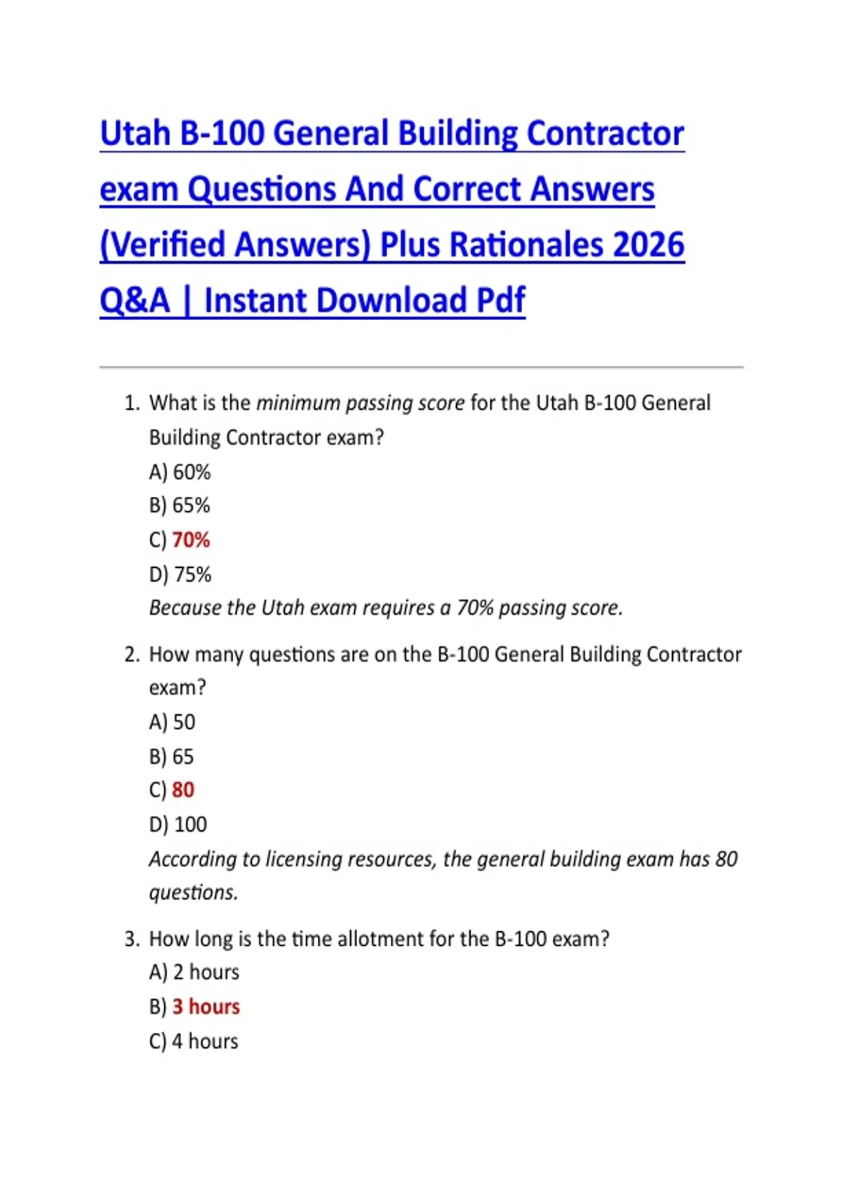 The Utah B-100 General Building Contractor Exam resource provides candidates with a comprehensive set of practice questions and verified correct answers to prepare for the Utah general building contractor licensing exam. This updated 2026/2027 version covers building codes, construction principles, safety regulations, project management, and business practices. The material supports exam preparation, reinforces essential knowledge, and helps learners improve test-taking strategies, confidence, and performance for successful Utah B-100 certification.