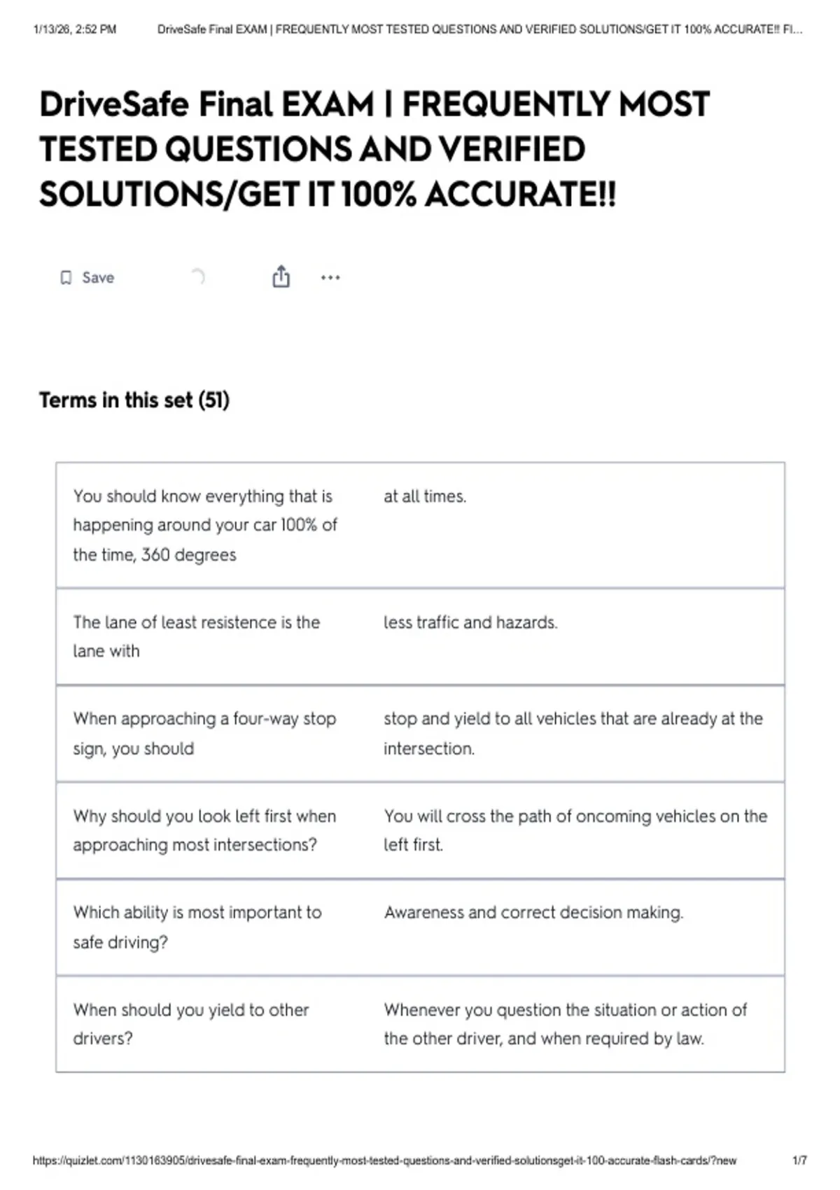 , 1/13/26, 2:52 PM DriveSafe Final EXAM | FREQUENTLY MOST TESTED QUESTIONS AND VERIFIED SOLUTIONS/GET IT 100% ACCURATE!! Fl…