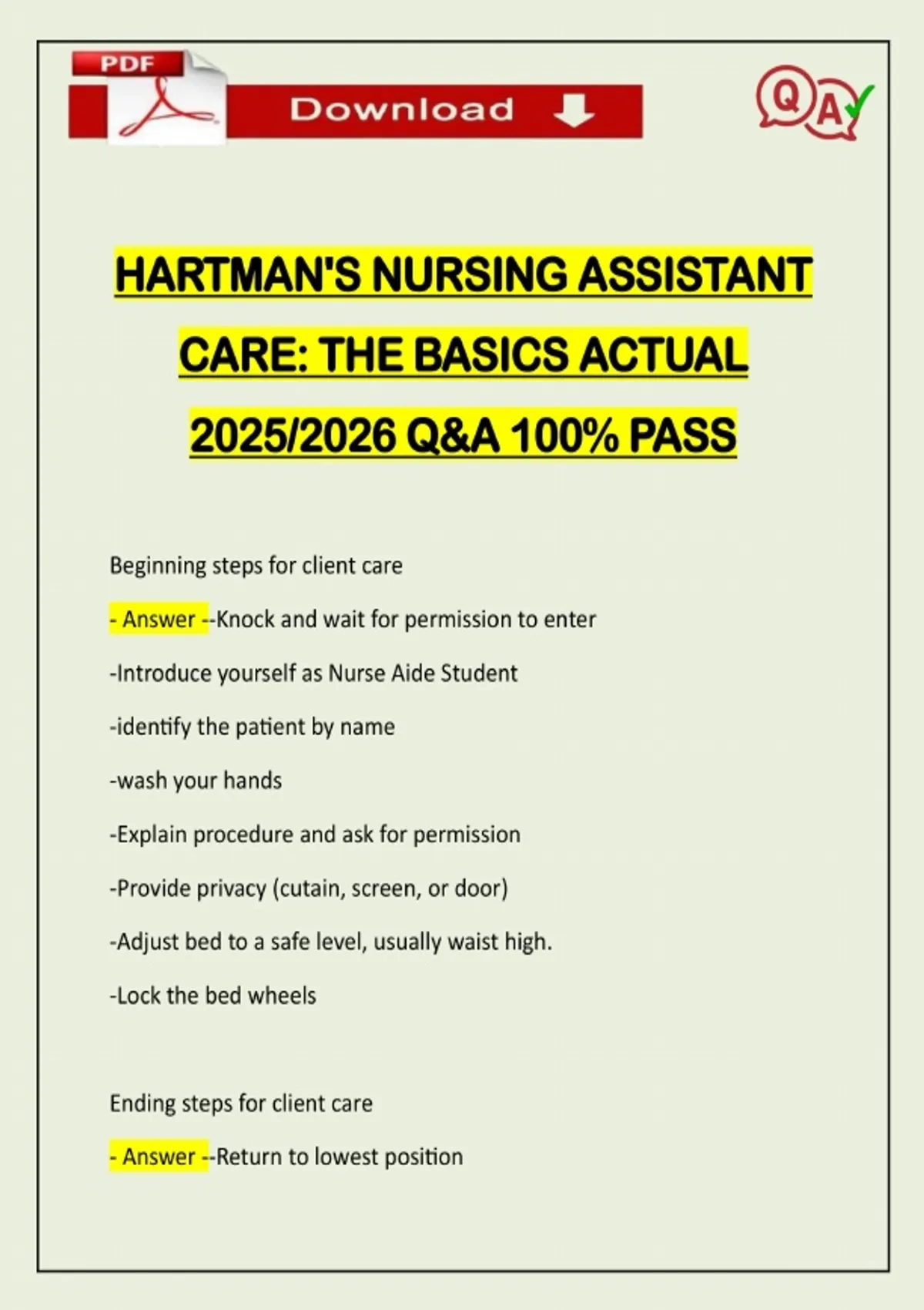 HARTMAN'S NURSING ASSISTANT CARE: THE BASICS ACTUAL 2026 Q&A 100% PASS