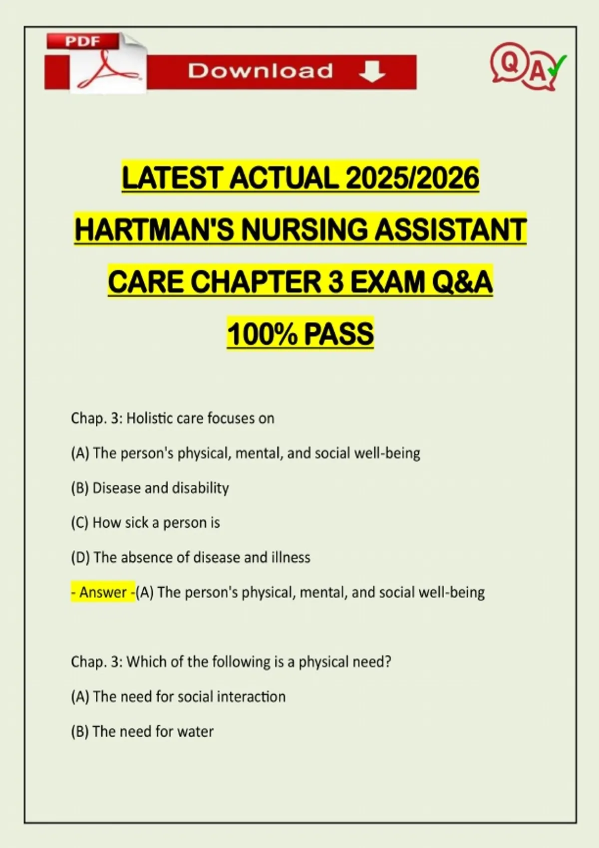 LATEST ACTUAL 2025/2026 HARTMAN'S NURSING ASSISTANT CARE CHAPTER 3 EXAM Q&A 100% PASS Chap. 3: Holistic care focuses on (A) The person's physical, mental, and social well-being (B) Disease and disability (C) How sick a person is (D) The absence of disease and illness - Answer -(A) The person's physical, mental, and social well-being Chap. 3: Which of the following is a physical need? (A) The need for social interaction (B)