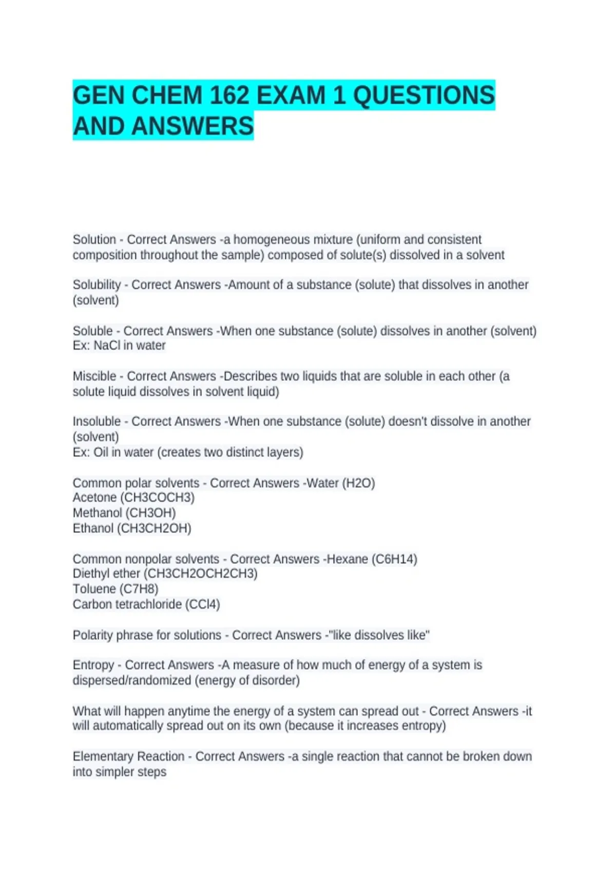 Common polar solvents - Correct Answers -Water (H2O)