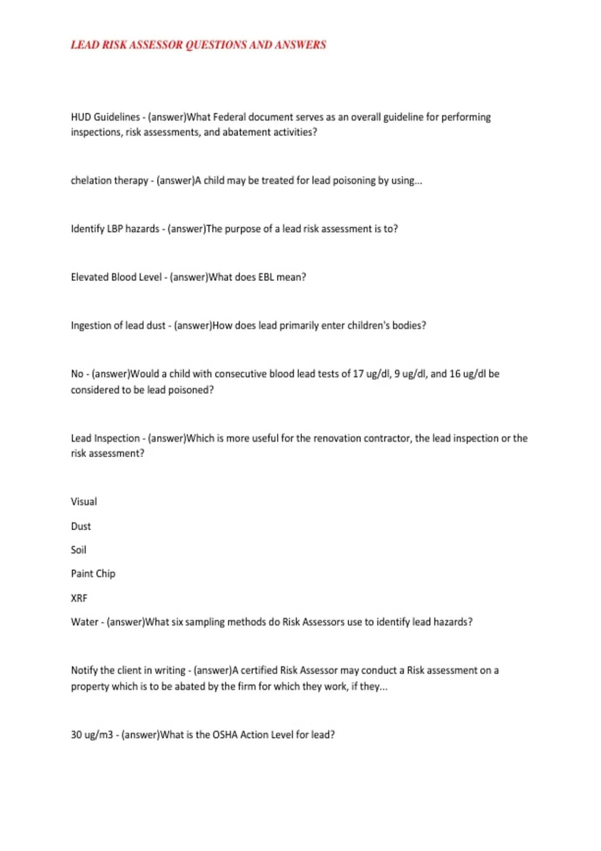 LEAD RISK ASSESSOR QUESTIONS AND ANSWERS