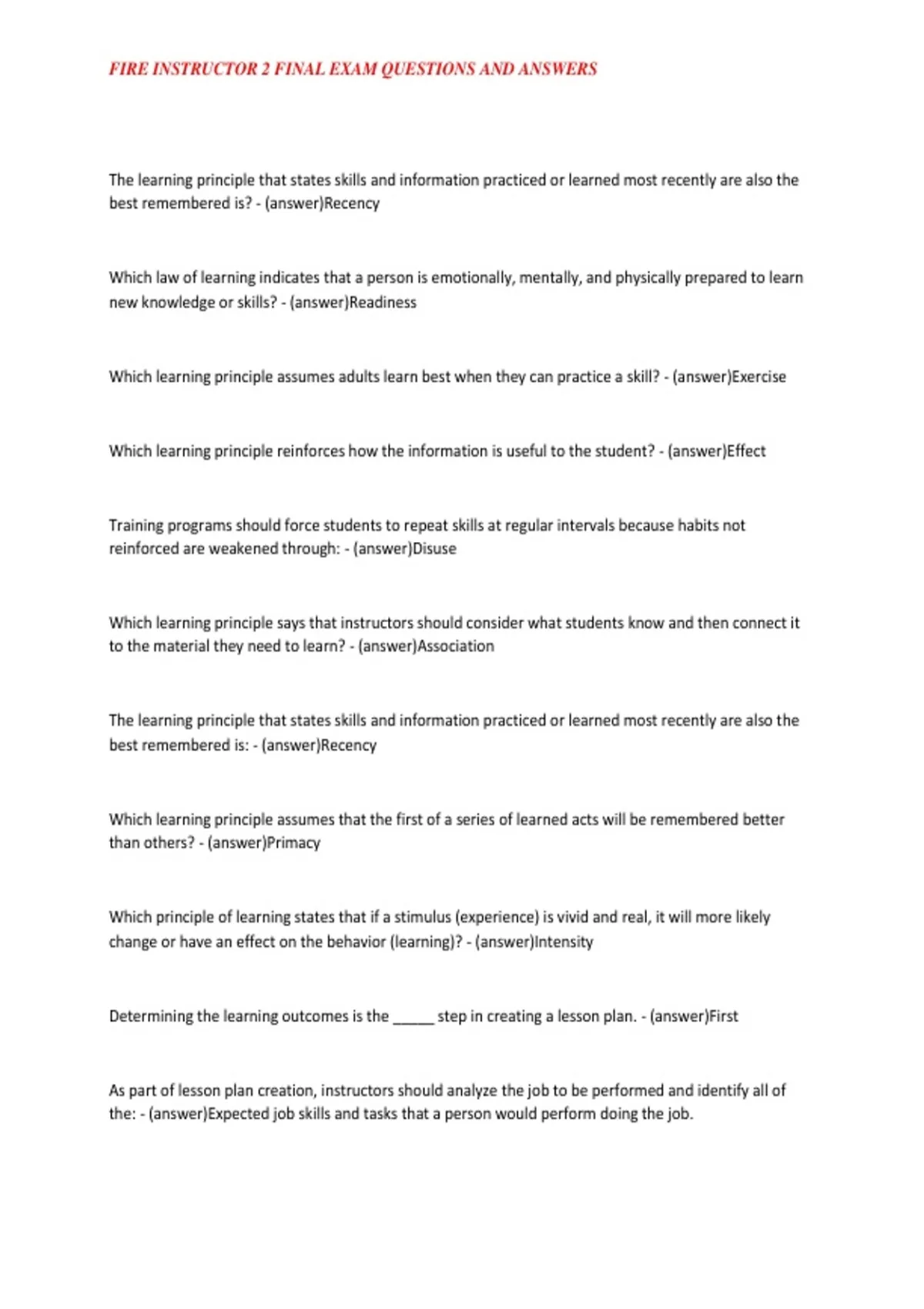 , FIRE INSTRUCTOR 2 FINAL EXAM QUESTIONS AND ANSWERS