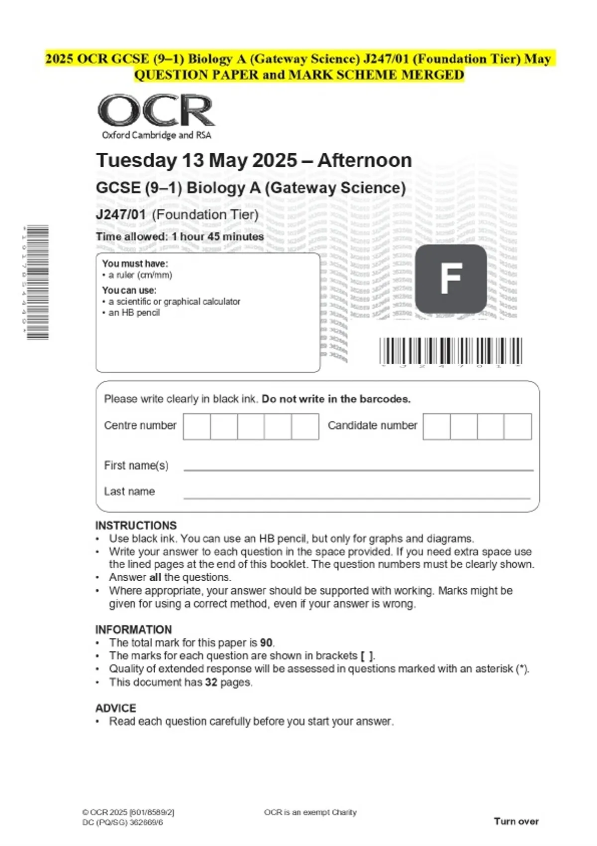 2025 OCR GCSE (9–1) Biology A (Gateway Science) J247/01 (Foundation Tier) May QUESTION PAPER and MARK SCHEME MERGED