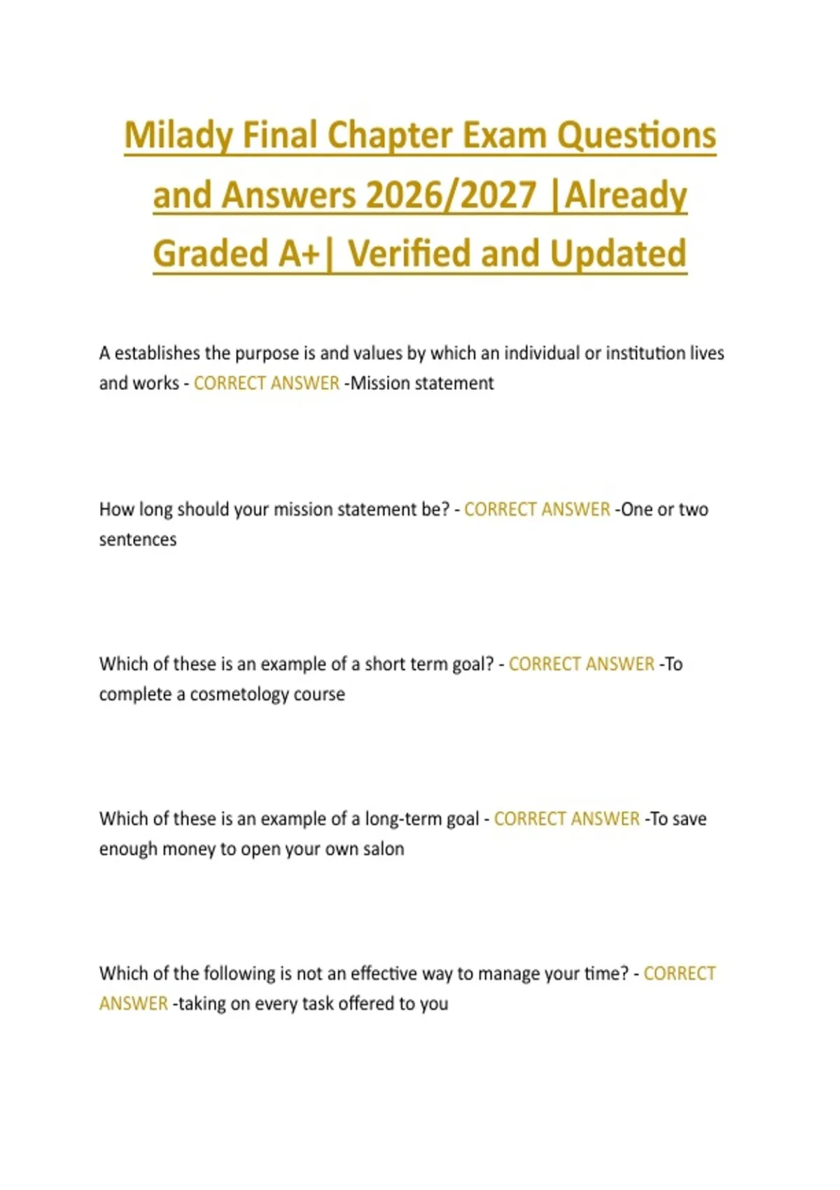 Milady Final Chapter Exam Questions and Answers 2026/2027 |Already Graded A+| Verified and Updated